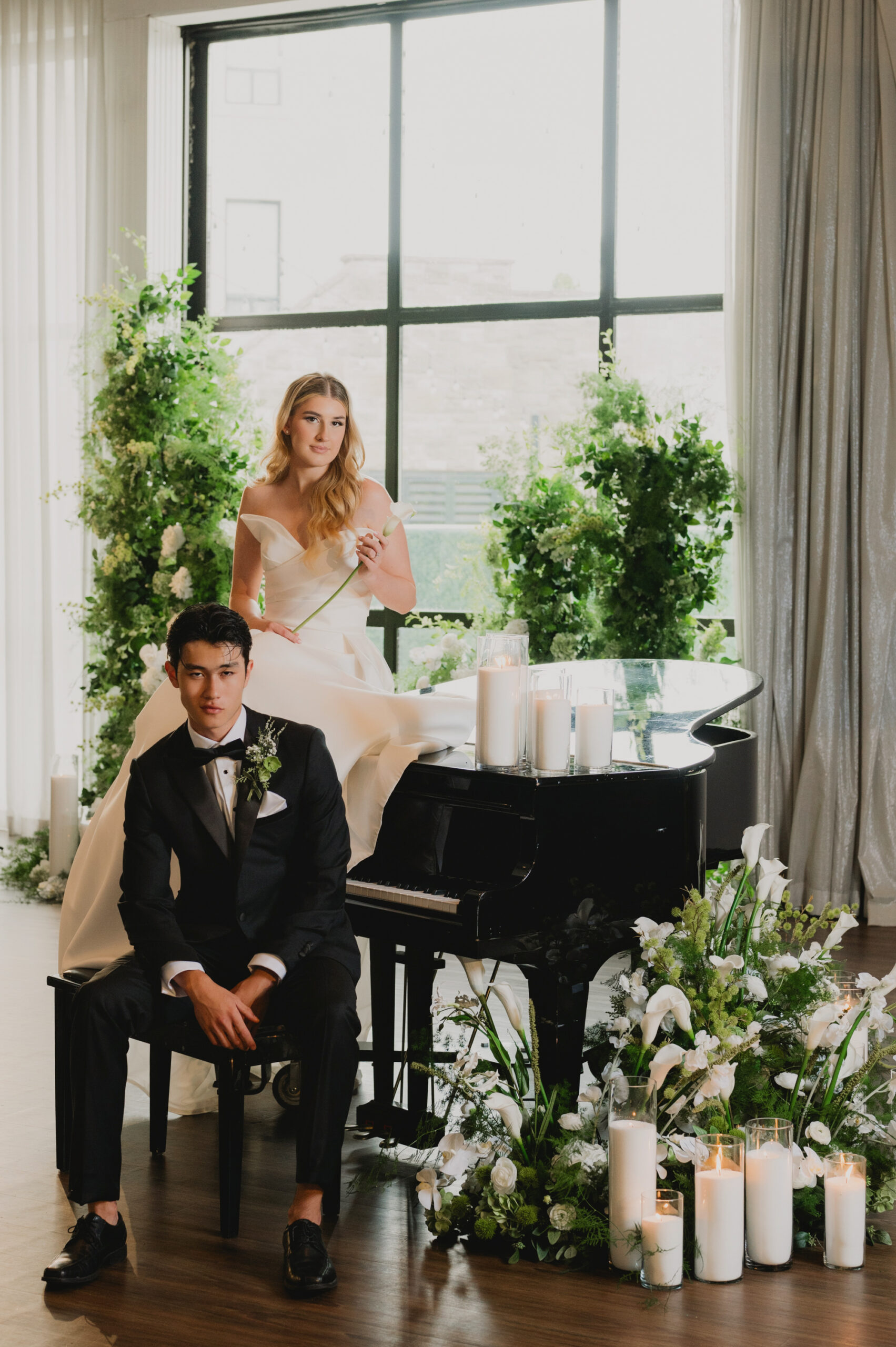 A man in a black tuxedo sits at a black grand piano adorned with white flower arrangements and lit candles. A woman in a white wedding gown stands behind him with one hand resting on the piano. Large windows and lush green plants add to the greenhouse grandeur of this sophisticated wedding scene.