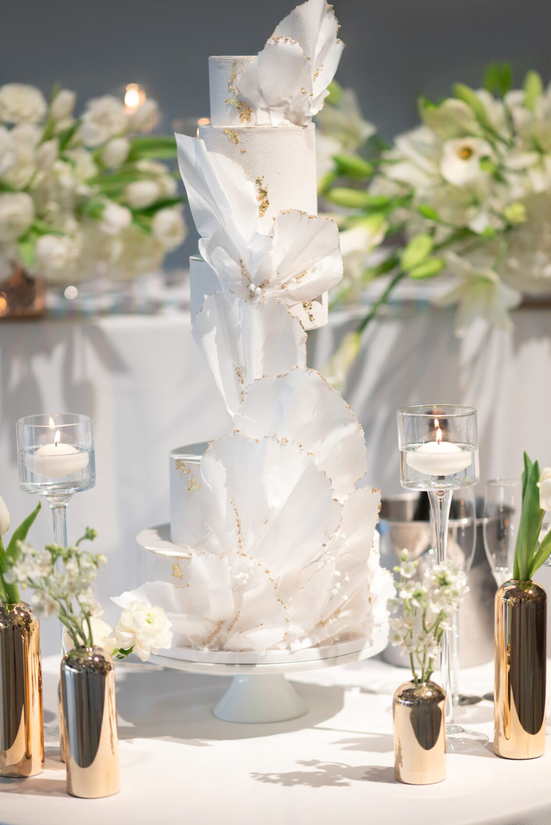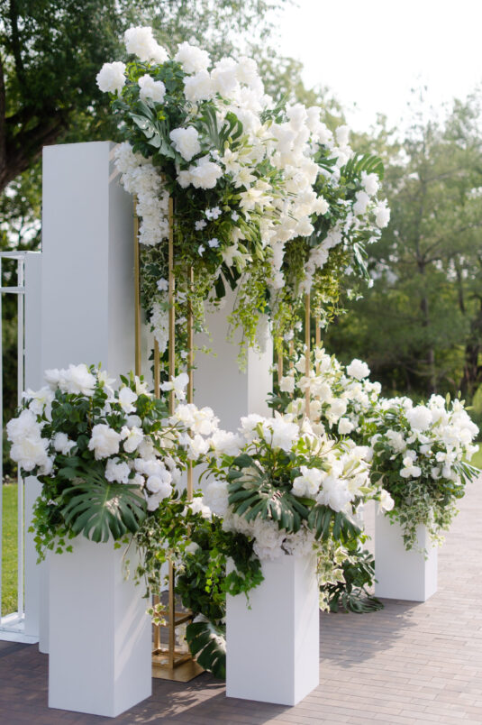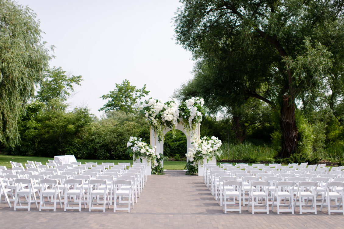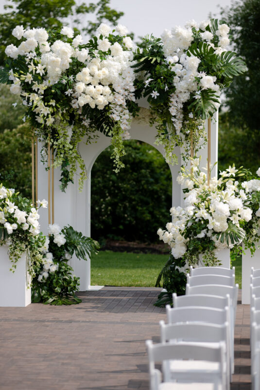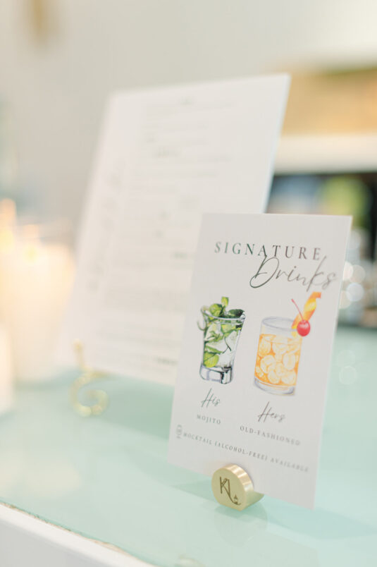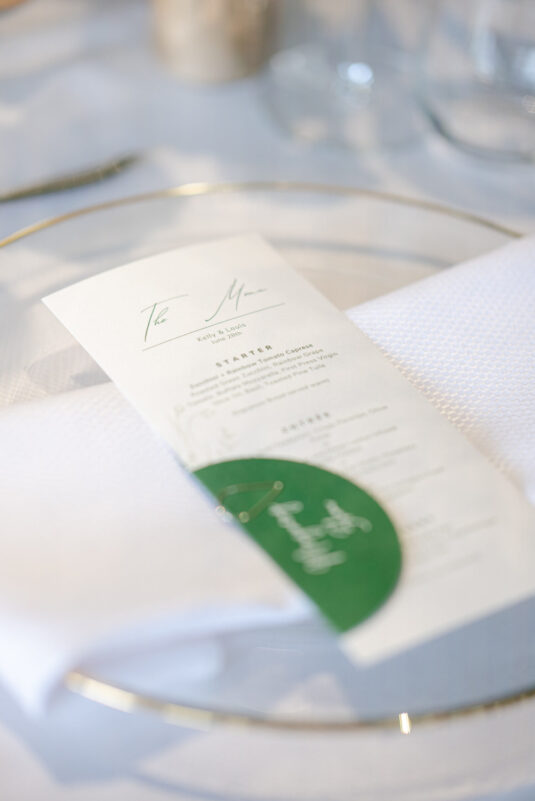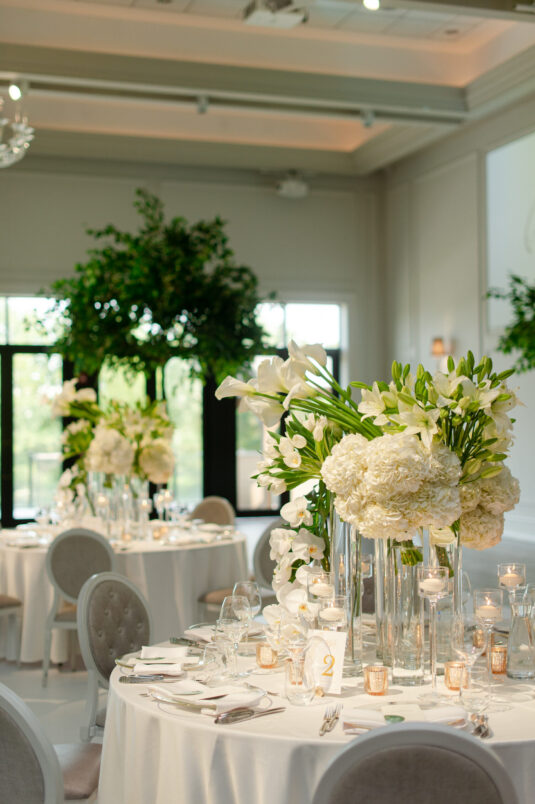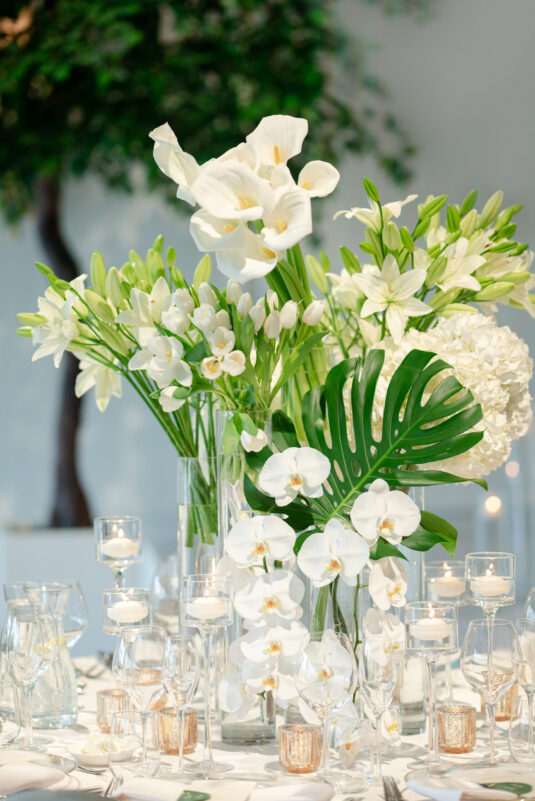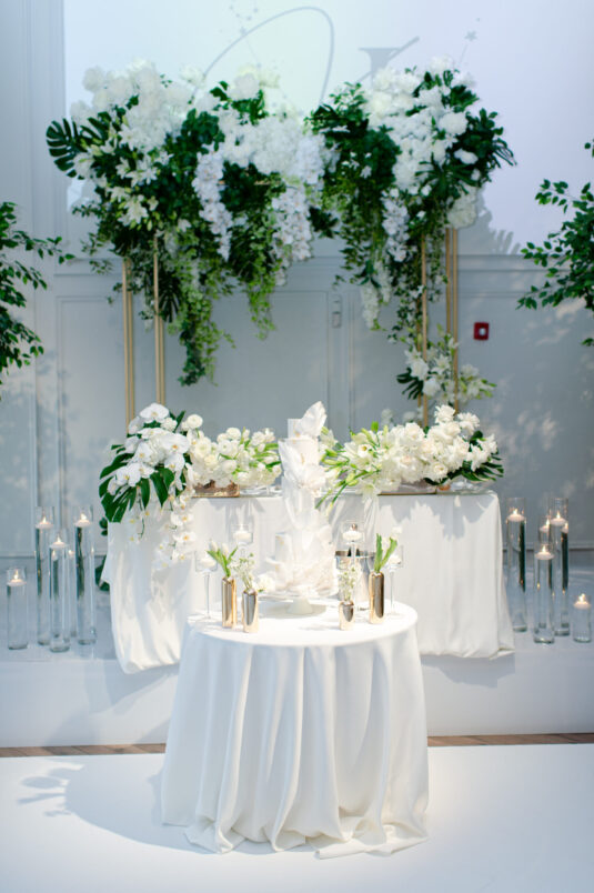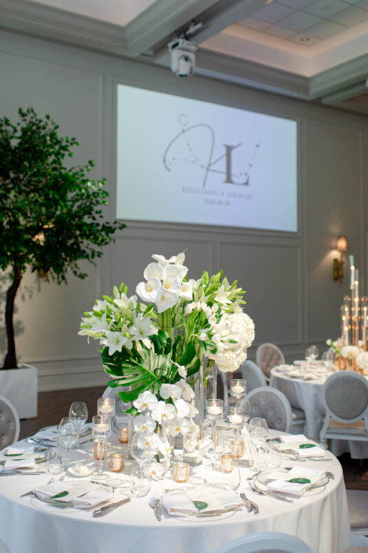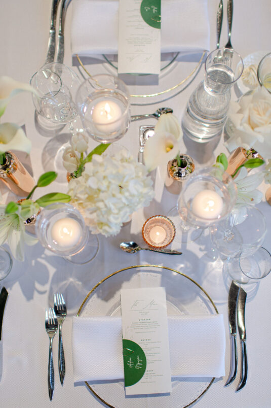 The timeless white and green decor, featuring lush floral arrangements of tulips, lilies, and orchids, created an atmosphere of refined beauty, while lounge furniture surrounding the dance floor invited guests to relax or join the dancing festivities. Personalized heart-shaped menu and place cards, which offered heartfelt thanks from Kelly and Louis, added a sentimental touch, ensuring that each guest felt appreciated.