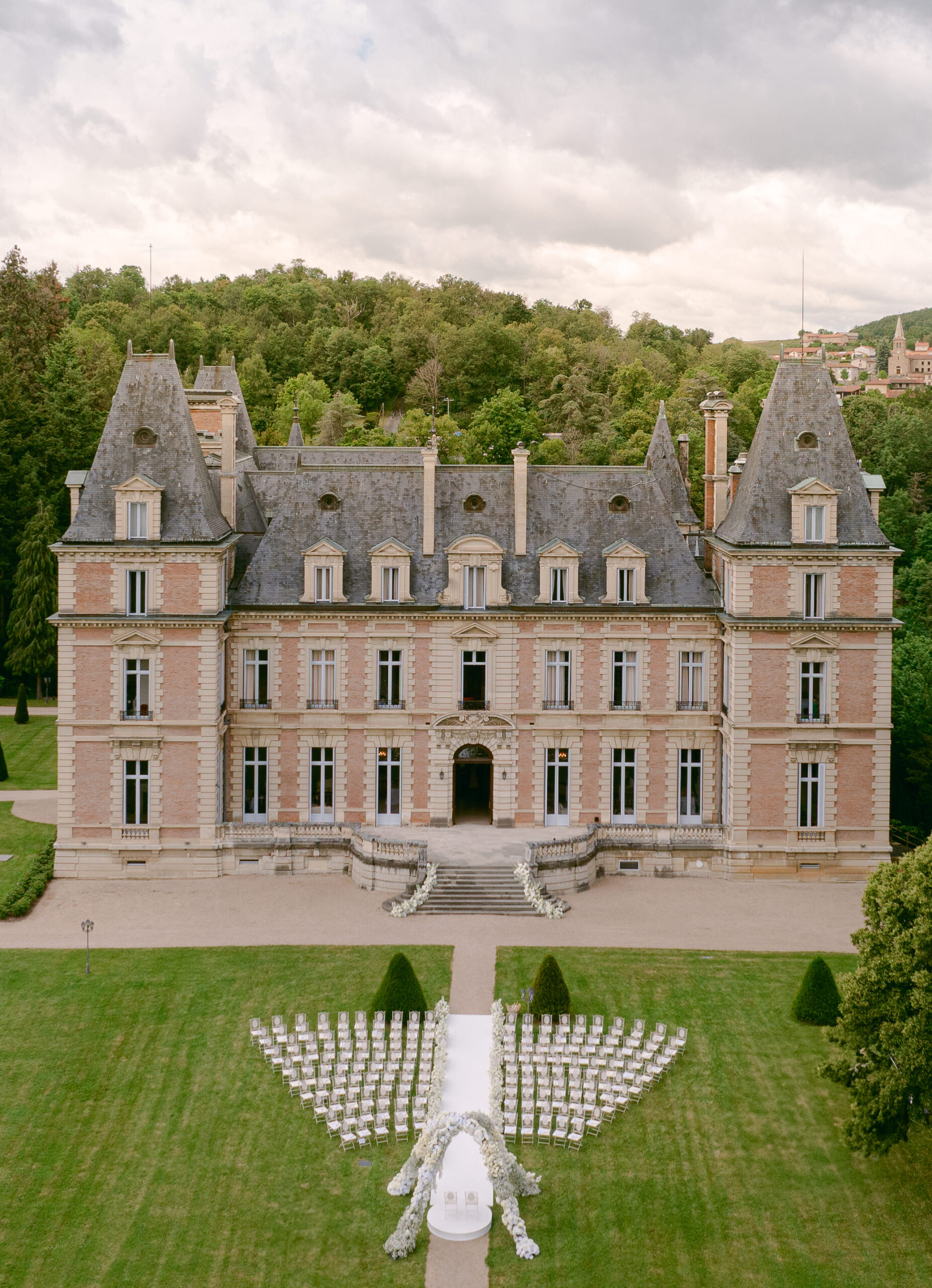 An elegant chateau with a symmetrical design stands surrounded by lush greenery in France. In front, rows of white chairs and a white aisle form a setup for an outdoor wedding. The sky is overcast with clouds, adding a touch of romance to this graceful affair.