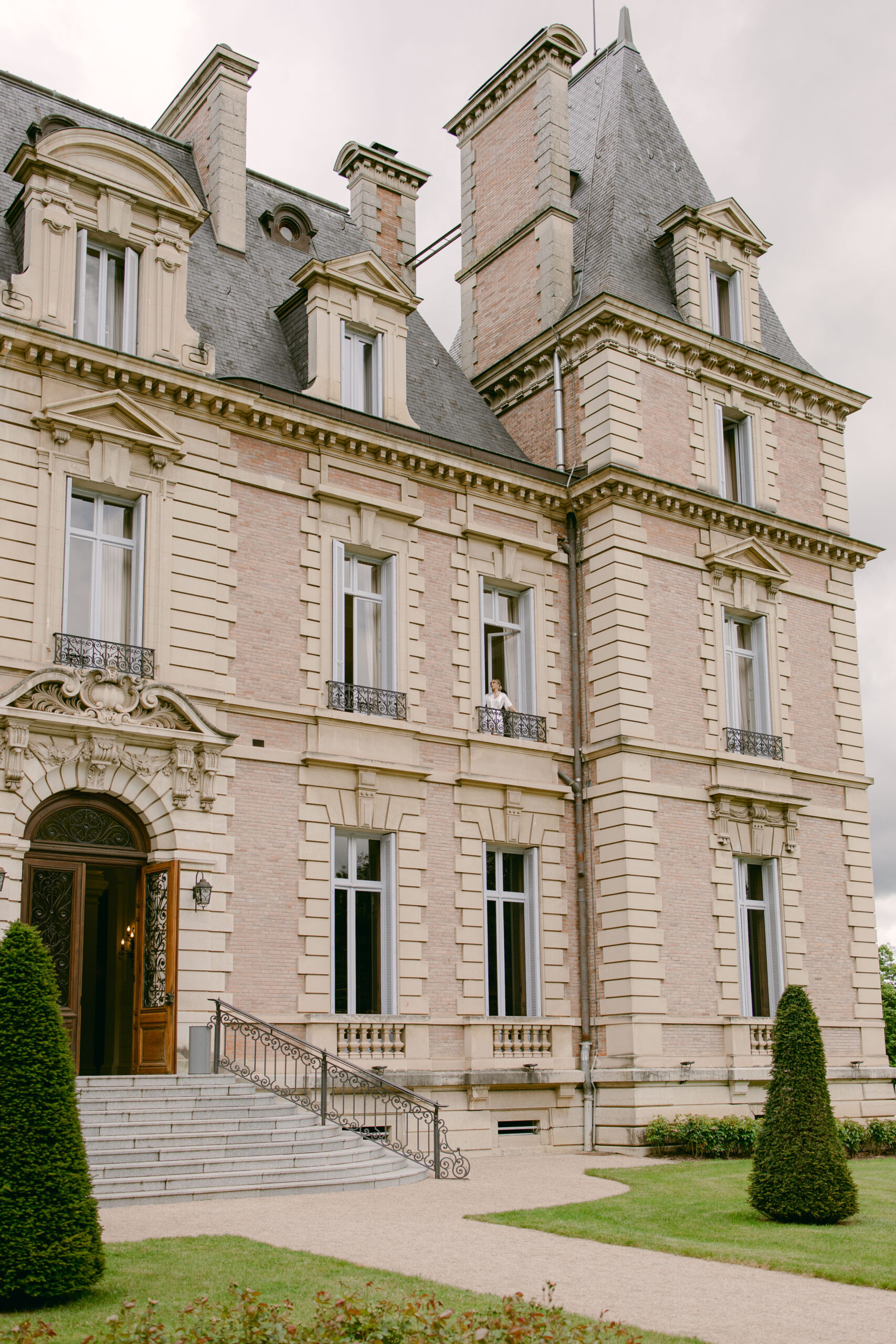 A grand historic building with intricate architectural details, this elegant chateau evokes the charm of a wedding in France. It features tall windows, ornate decorations, and a towering brick and stone facade. Manicured shrubs line the pathway leading up to the entrance.