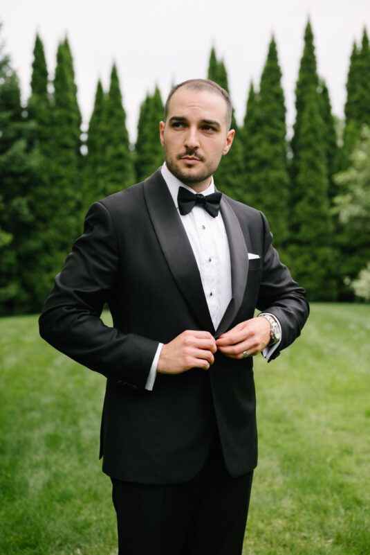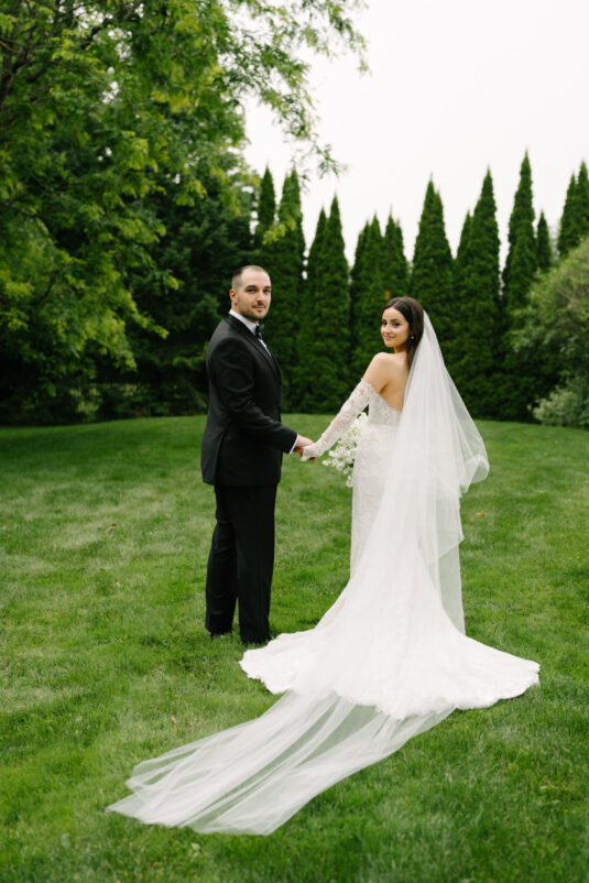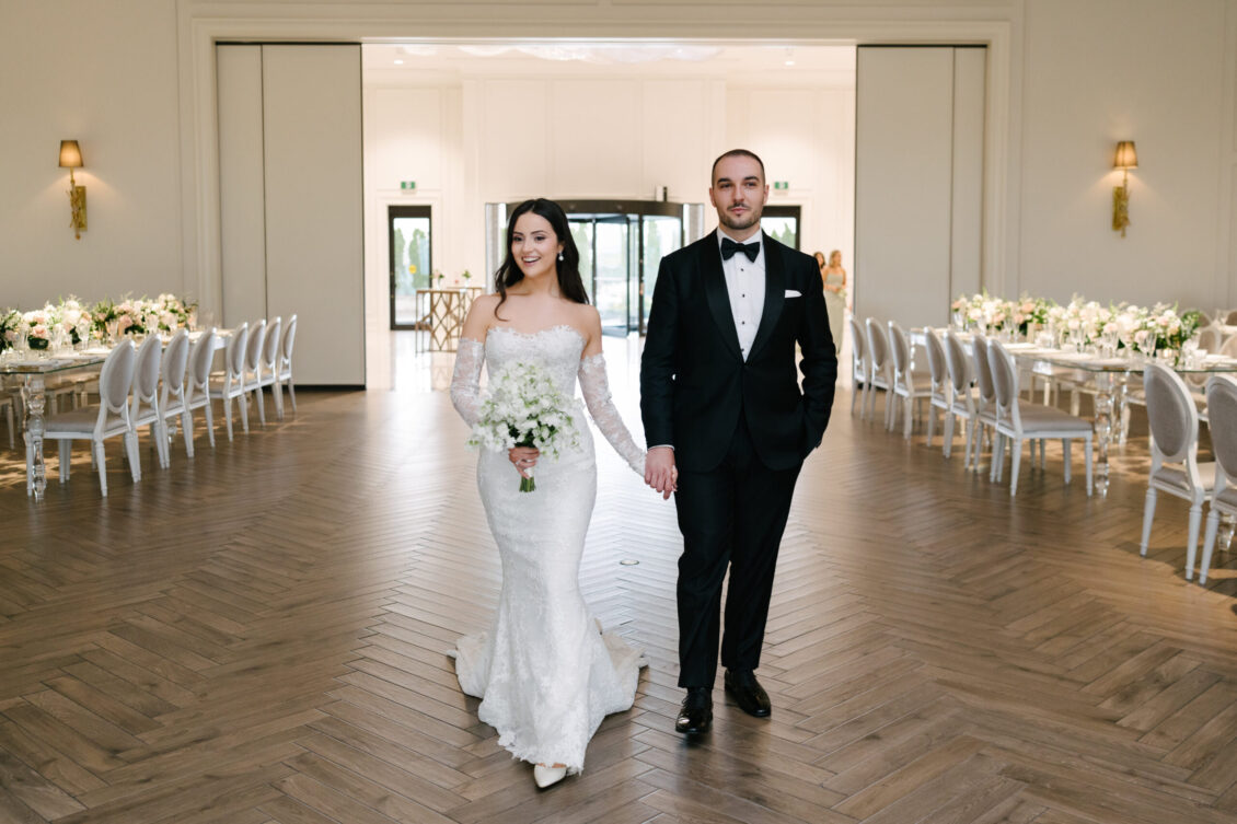 The Arlington Estate set the stage for their wedding day, which was inspired by the essence of a vintage classic dinner party. Under the expert guidance of Vanessa Victoria Weddings, every detail exuded timeless charm. The couple incorporated vintage crystal candleware, gold accents, and floral arrangements crafted by