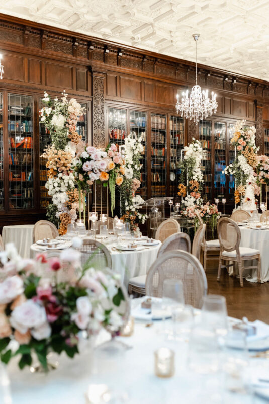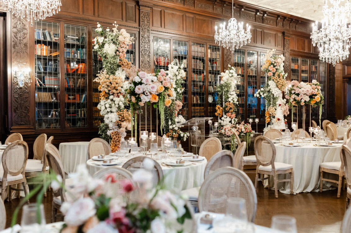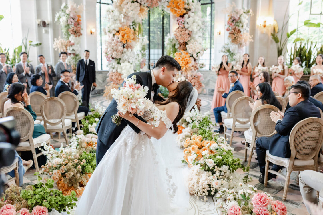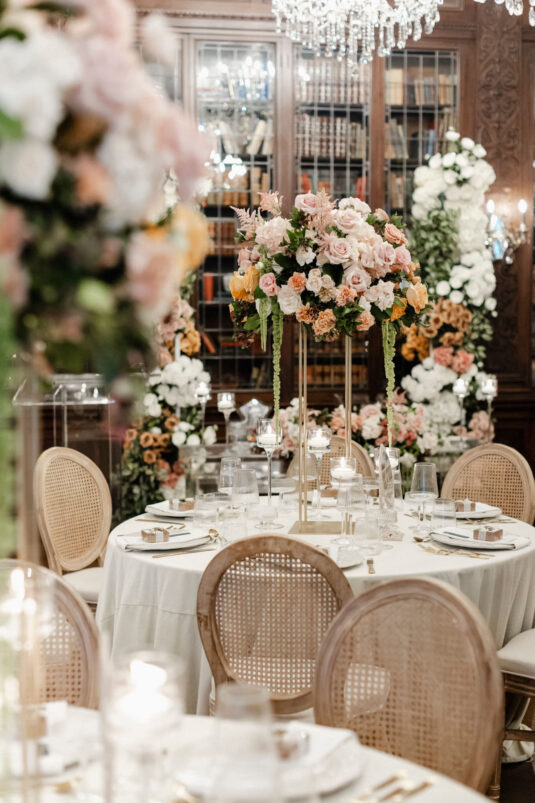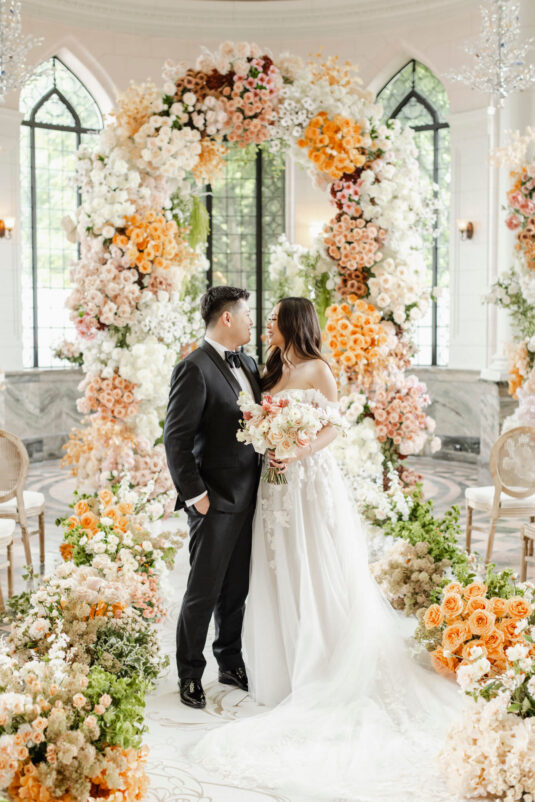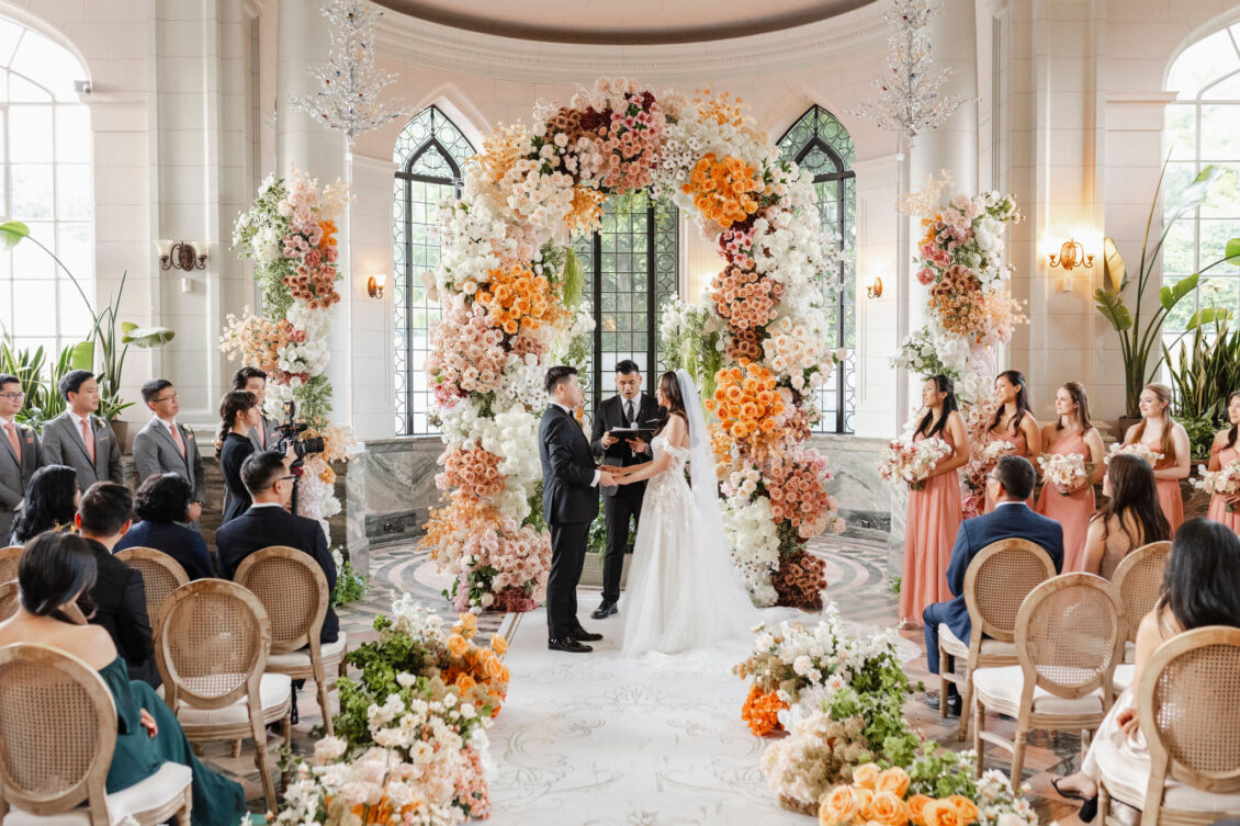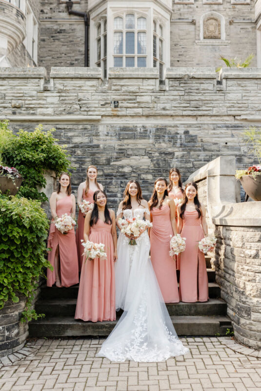 The couple envisioned a classy, vintage-feeling wedding straight out of a modern fairytale, perfectly complementing Casa Loma’s iconic grey stone walls and rich wood paneling. Inspired by their travels, Alyssa and Lyon chose earthy-toned florals to adorn the venue, with breathtaking arrangements designed to enhance the venue’s architectural beauty. The picturesque conservatory was transformed into a floral wonderland, featuring high and low center aisle arrangements, a stunning fountain display, and a grand floral arch that served as the ceremony’s focal point.