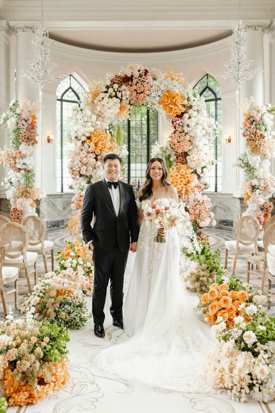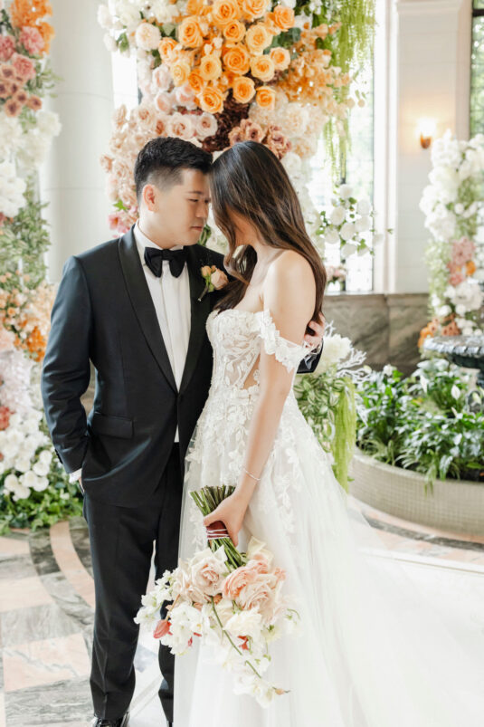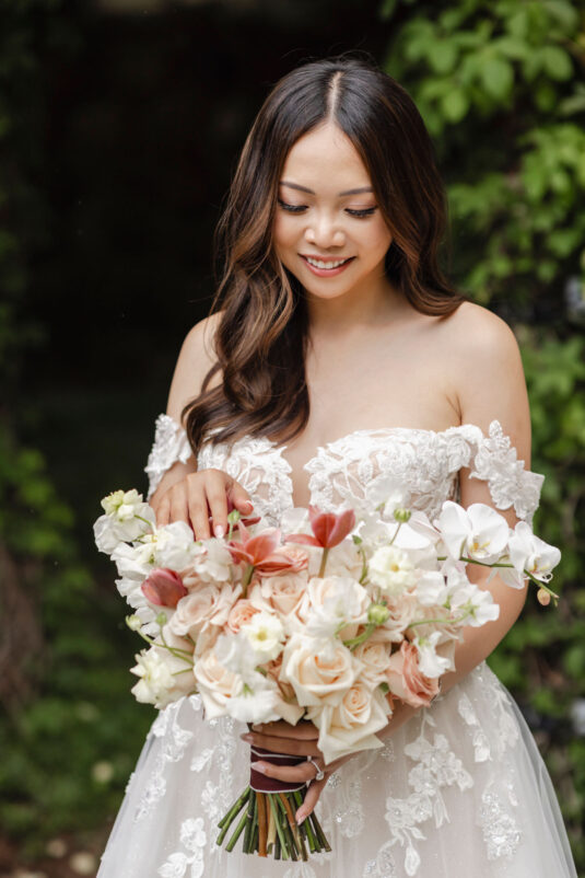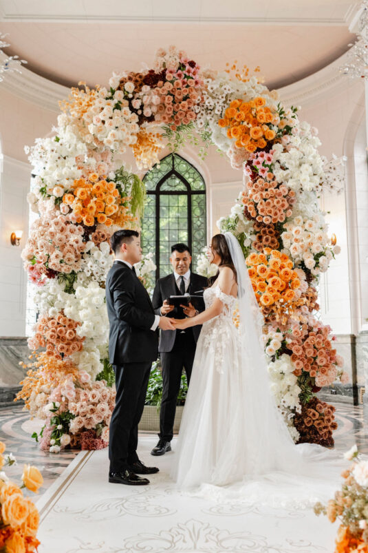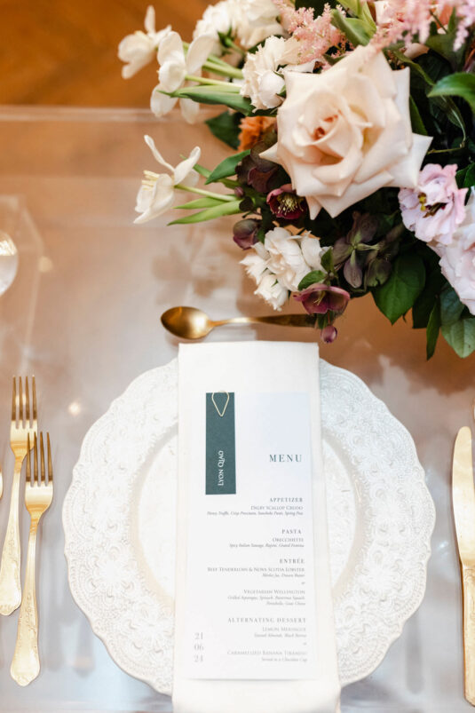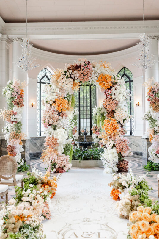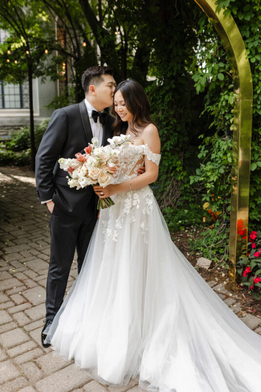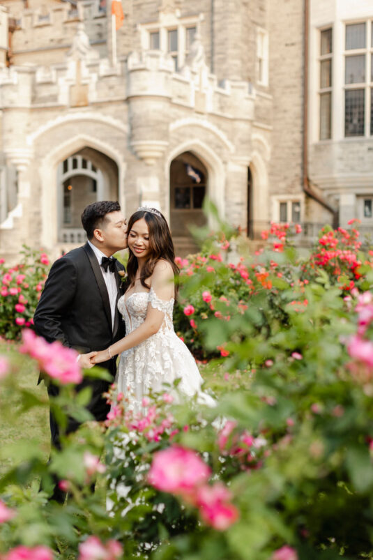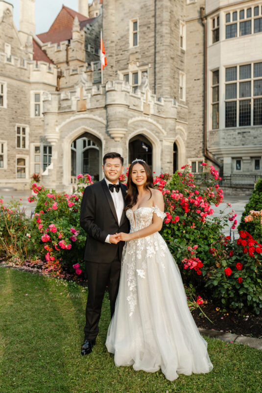 The couple envisioned a classy, vintage-feeling wedding straight out of a modern fairytale, perfectly complementing Casa Loma’s iconic grey stone walls and rich wood paneling. Inspired by their travels, Alyssa and Lyon chose earthy-toned florals to adorn the venue, with breathtaking arrangements designed to enhance the venue’s architectural beauty. The picturesque conservatory was transformed into a floral wonderland, featuring high and low center aisle arrangements, a stunning fountain display, and a grand floral arch that served as the ceremony’s focal point.