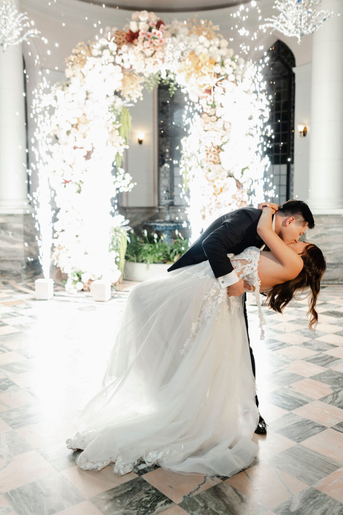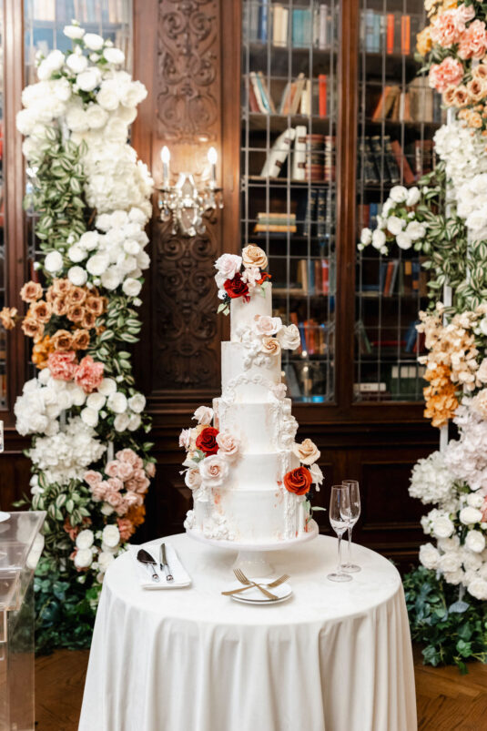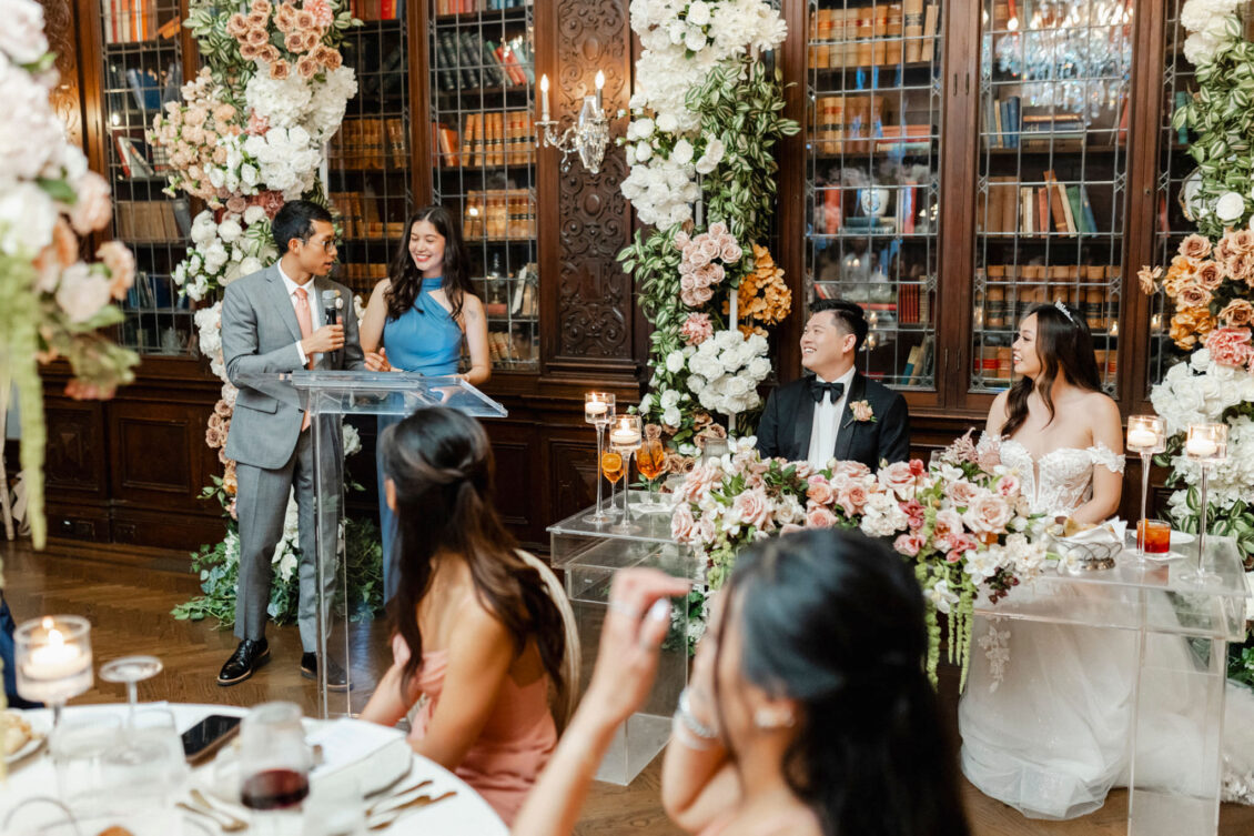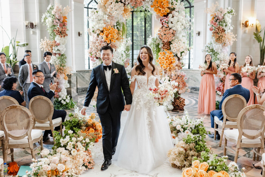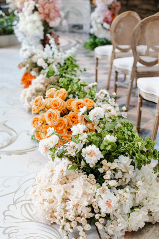 The couple envisioned a classy, vintage-feeling wedding straight out of a modern fairytale, perfectly complementing Casa Loma’s iconic grey stone walls and rich wood paneling. Inspired by their travels, Alyssa and Lyon chose earthy-toned florals to adorn the venue, with breathtaking arrangements designed to enhance the venue’s architectural beauty. The picturesque conservatory was transformed into a floral wonderland, featuring high and low center aisle arrangements, a stunning fountain display, and a grand floral arch that served as the ceremony’s focal point.