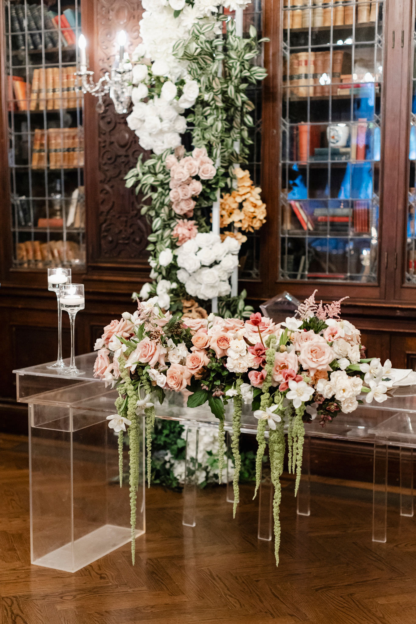 An elegant modern fairytale wedding setup at Casa Loma features a floral arrangement of pink, white, and peach flowers atop a transparent table. In the background, a tall bookshelf brimming with books and cascading blooms enhances the luxurious atmosphere.