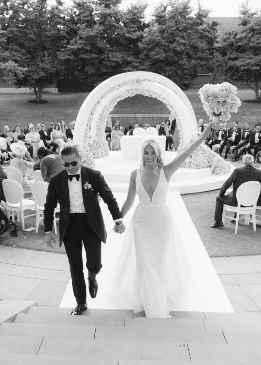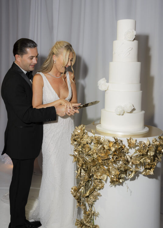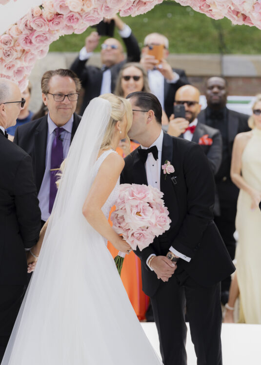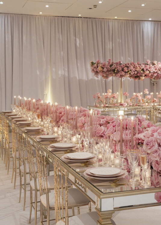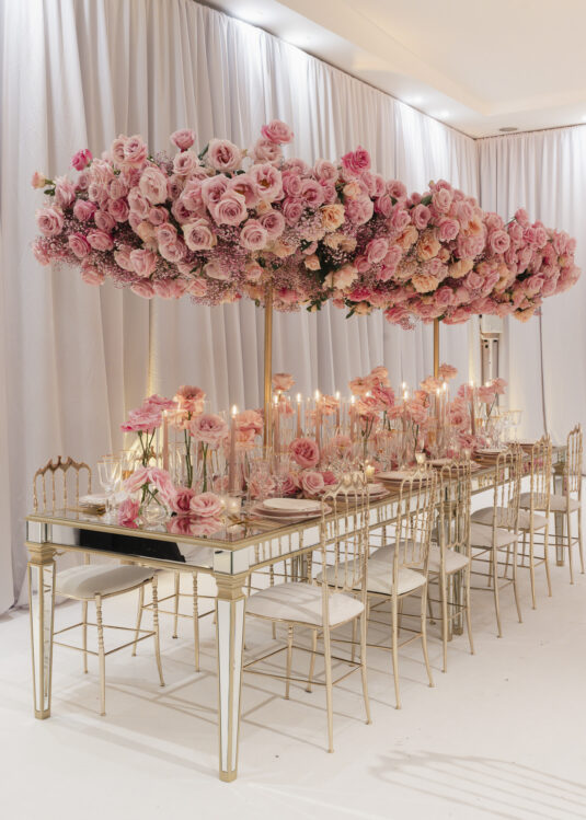 The ceremony setup was a true showstopper, breaking tradition with a unique circular layout surrounded by lush blooms. The design created an intimate, all-encompassing atmosphere that left guests in awe. For the reception, florist Larry Walshe curated breathtaking floral installations that elevated the dining experience. Overhead arrangements of full-bloom flexed pink roses added drama and sophistication, perfectly complementing the romantic theme.