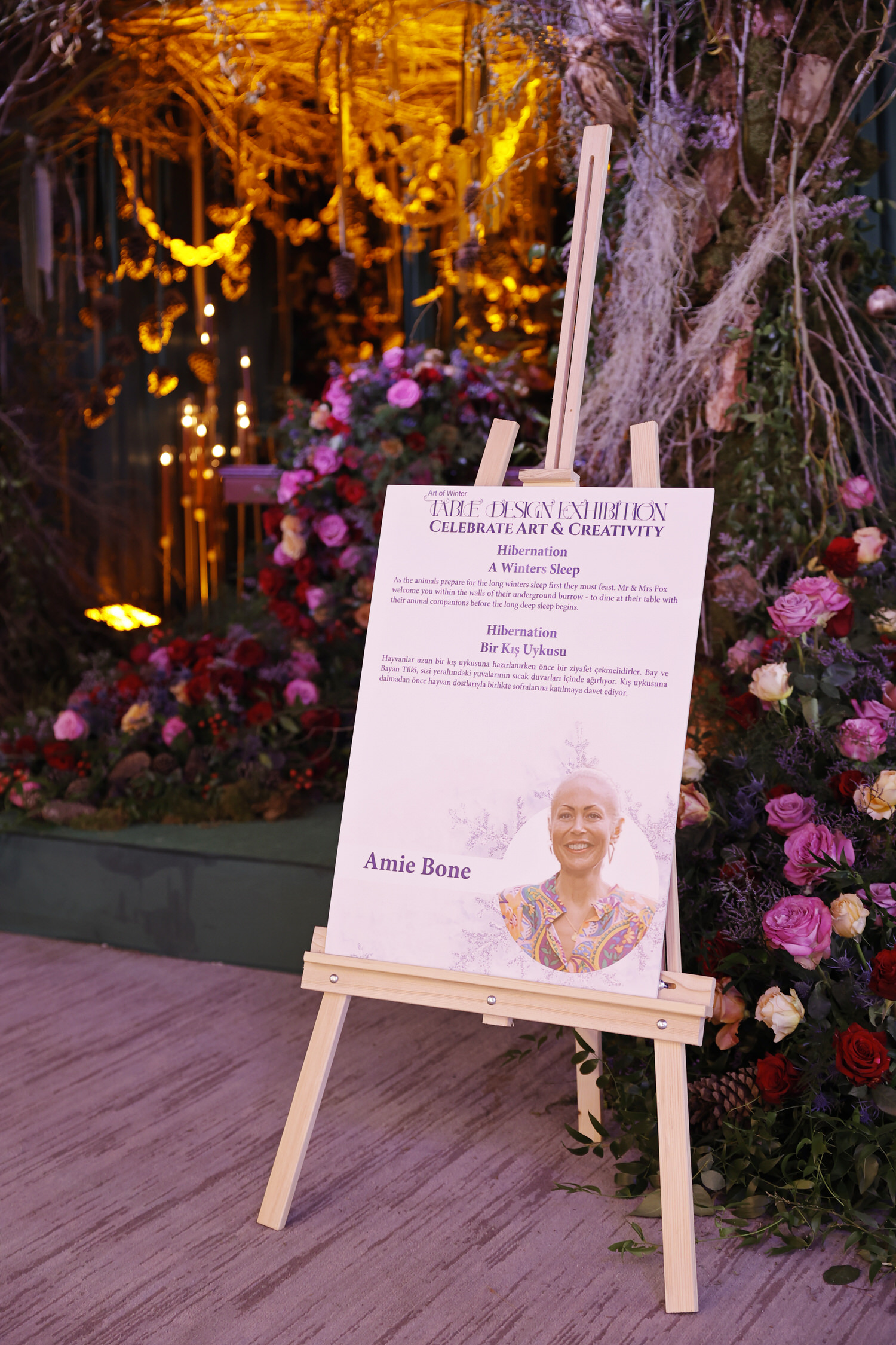 An easel holds a poster against a backdrop of floral decor, showcasing details about the Table Design Exhibition in Istanbul. The elegant floral design is accentuated by warm ambient lighting, with chandeliers and lush greenery enhancing the enchanting atmosphere.
