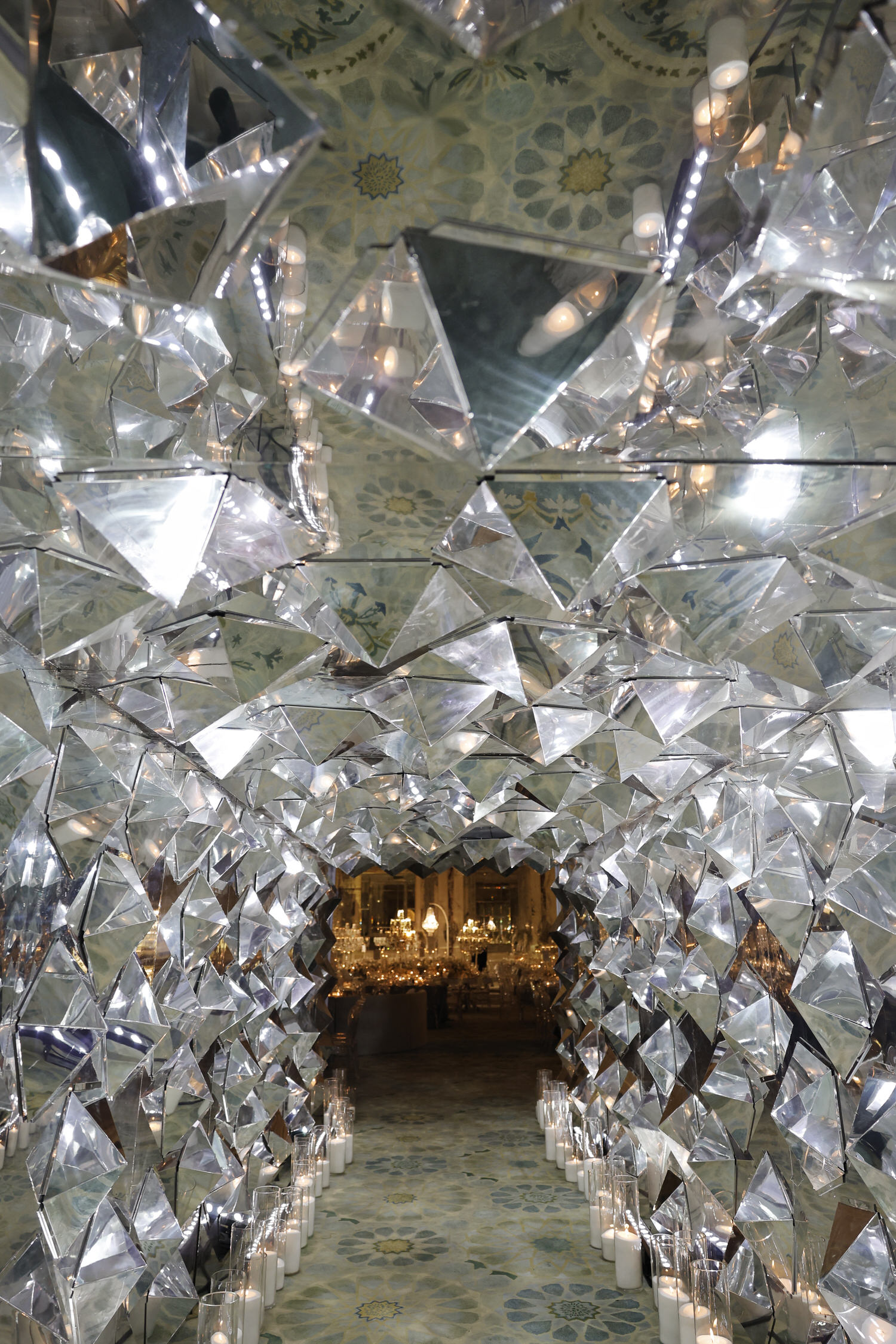 A tunnel made of reflective, angular mirrors creates a kaleidoscope effect, guiding visitors to the Third Annual Table Design Exhibition in Istanbul. Candles line the floor along the mirrored path, and a floral pattern decorates the ceiling.