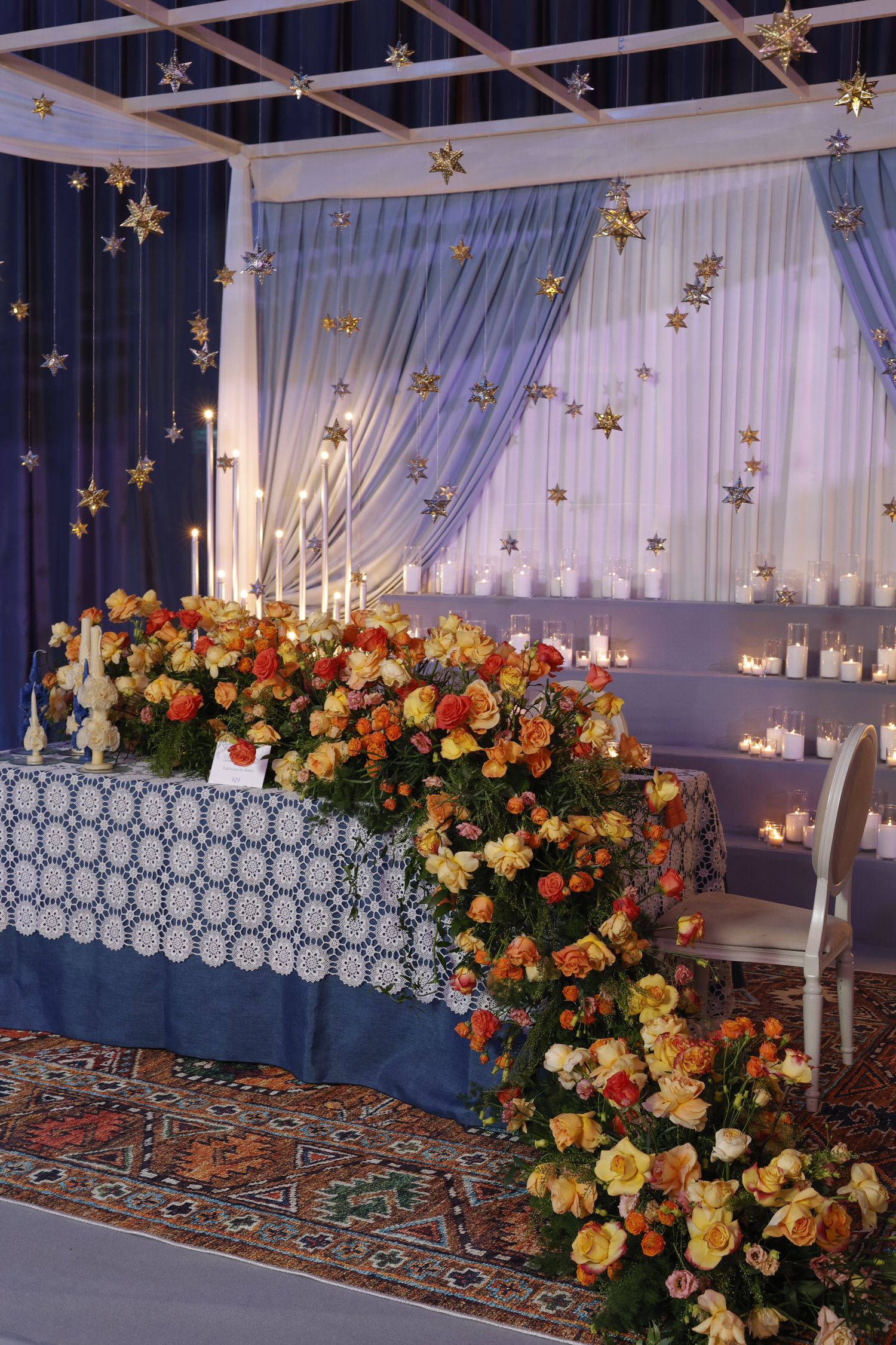 At Istanbul’s renowned Table Design Exhibition, a lavishly decorated table features a blue lace tablecloth and cascading orange and yellow roses. Candles and golden star decorations hang above, creating a romantic ambiance against draped blue and white curtains.