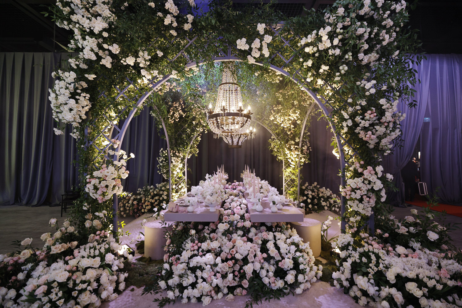 An elegant wedding setup in Istanbul features a long table with white and pink floral arrangements under a large crystal chandelier. This stunning display, part of the annual Table Design Exhibition, sees an arch adorned with abundant greenery and flowers, creating a romantic and lavish atmosphere.