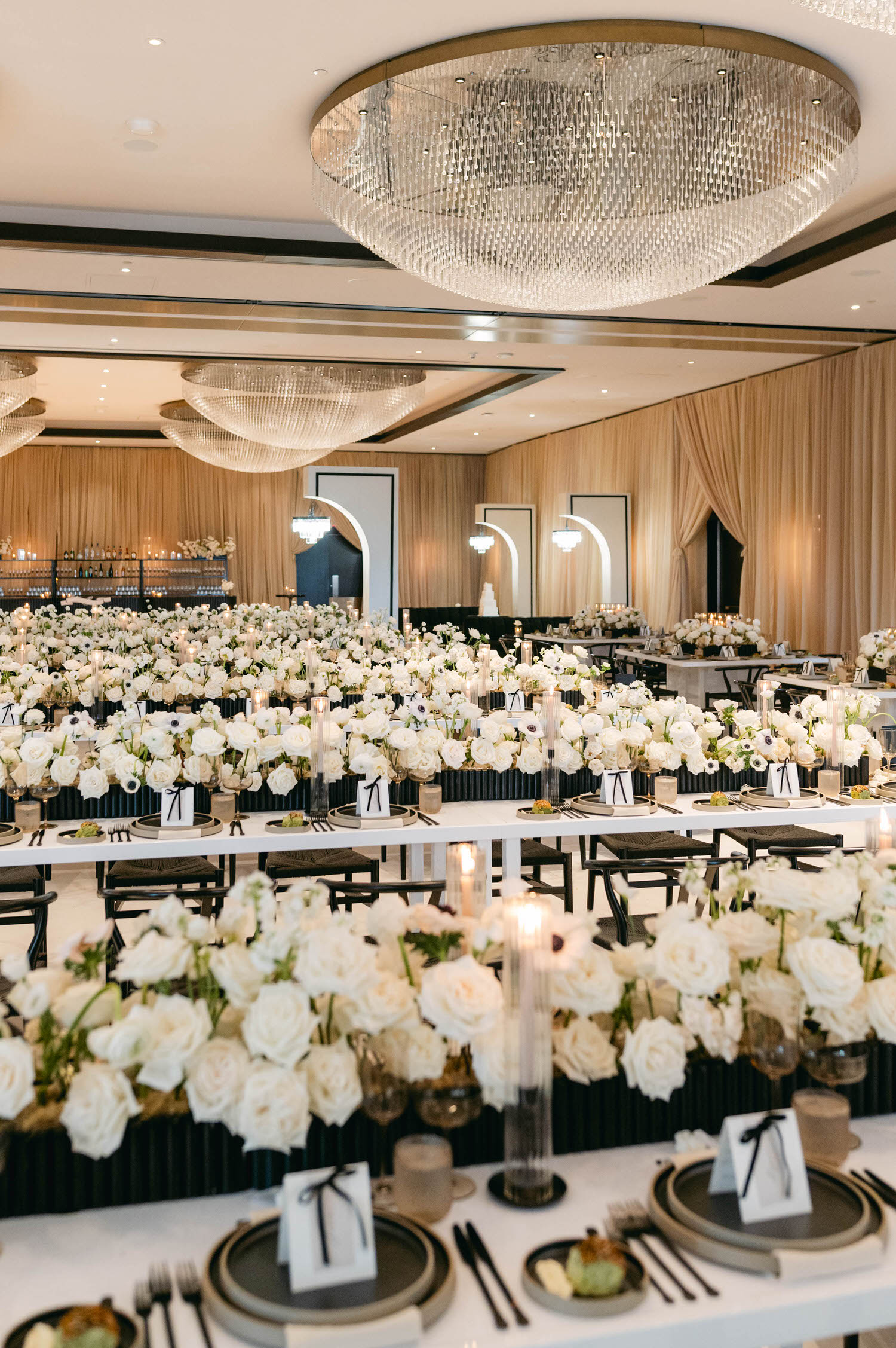 A luxurious banquet hall at Hotel X Toronto is elegantly set for a modern wedding. Tables boast abundant white rose centerpieces, candles, and place settings. The room features large chandeliers and warm drapery, creating an opulent atmosphere perfect for your special day.
