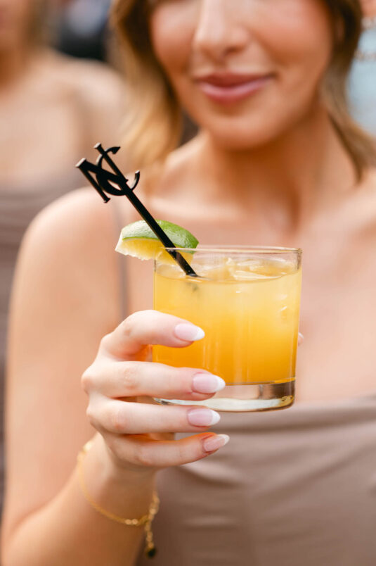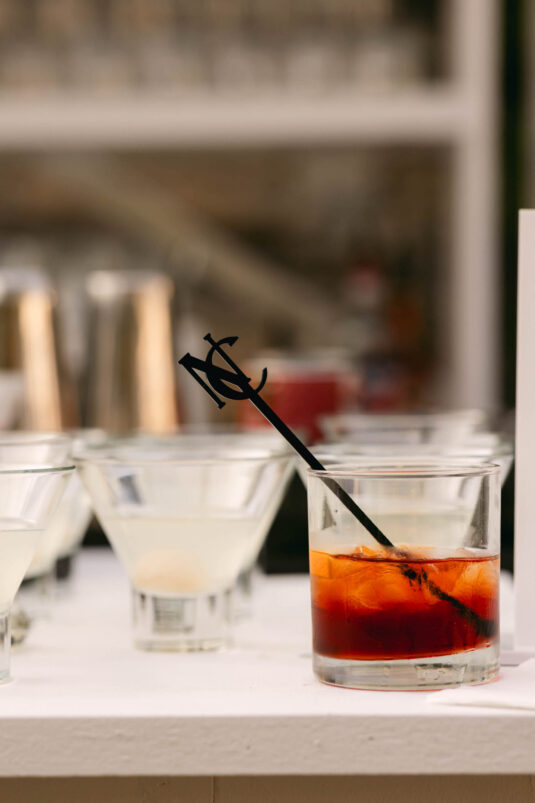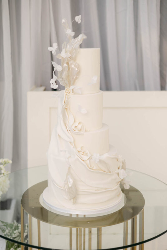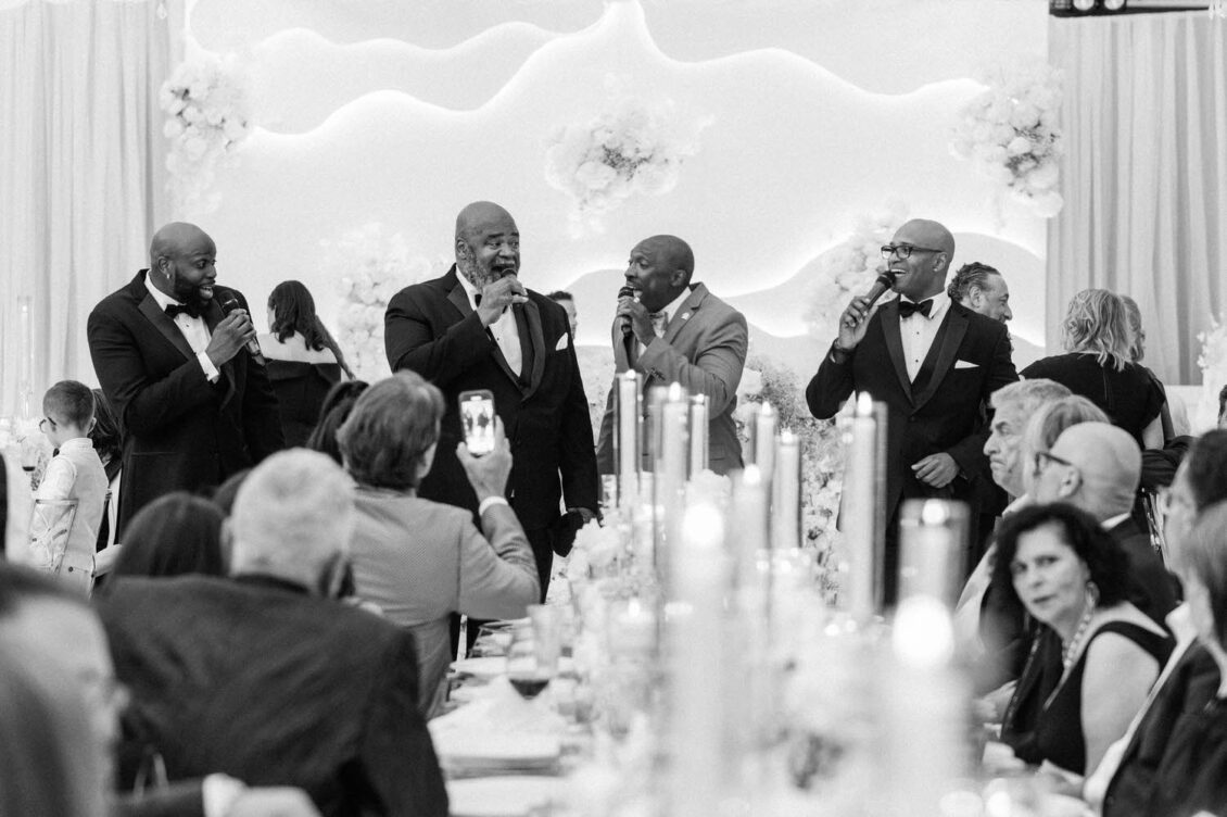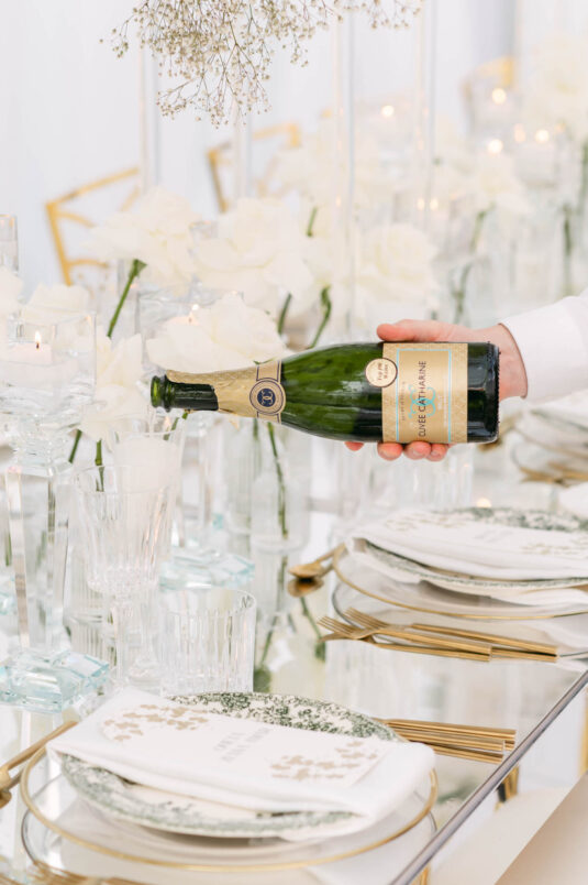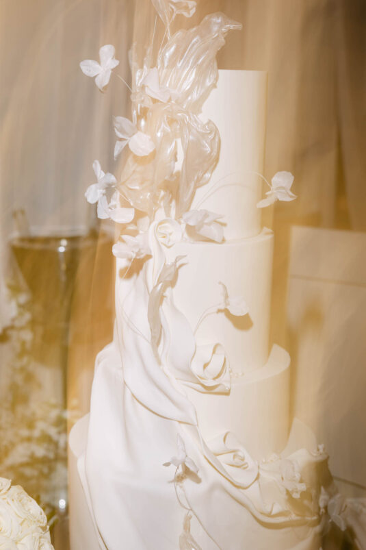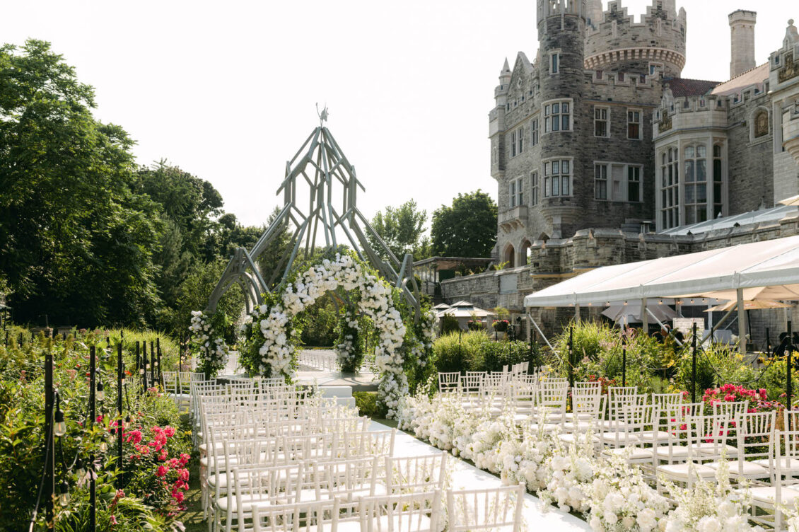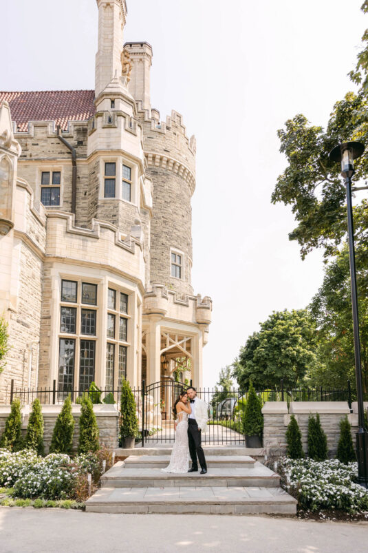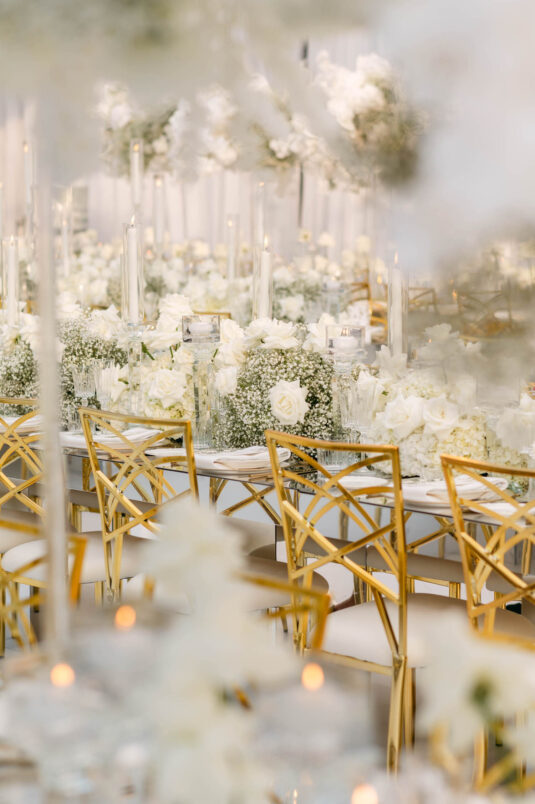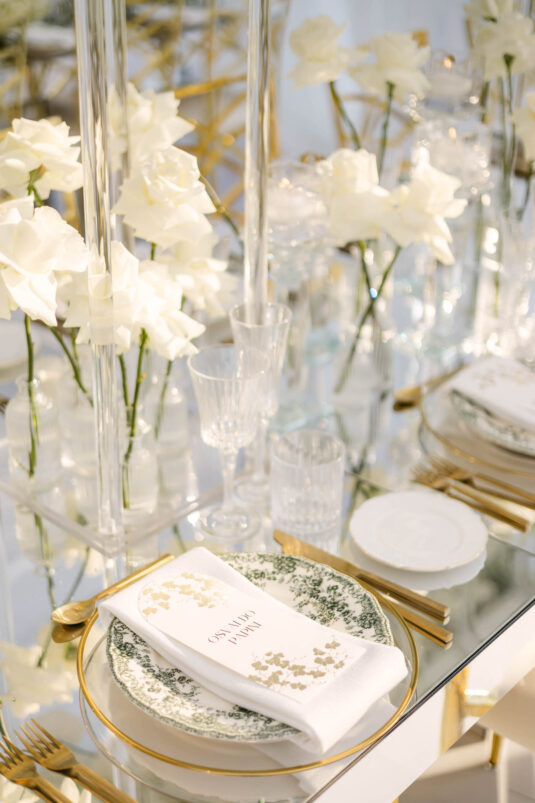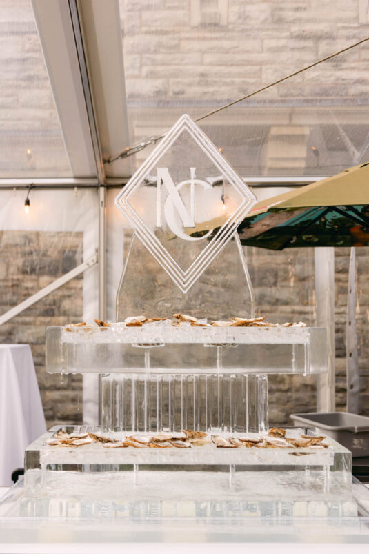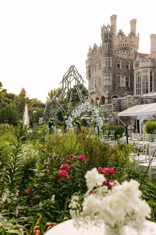 The reception took place in Casa Loma’s glass pavilion, which was transformed into an elegant, all-white space. Guests dined at tables adorned with textured floral arrangements in varying heights, designed by R5 Event Design, and complemented by gold accents and ornate tableware. The evening featured several custom design elements, including monogrammed stationery, food packaging, and ice sculptures.