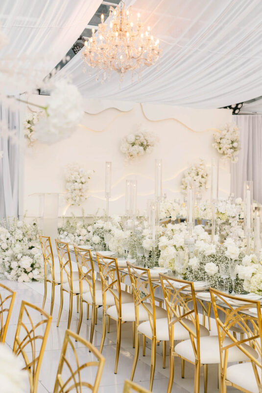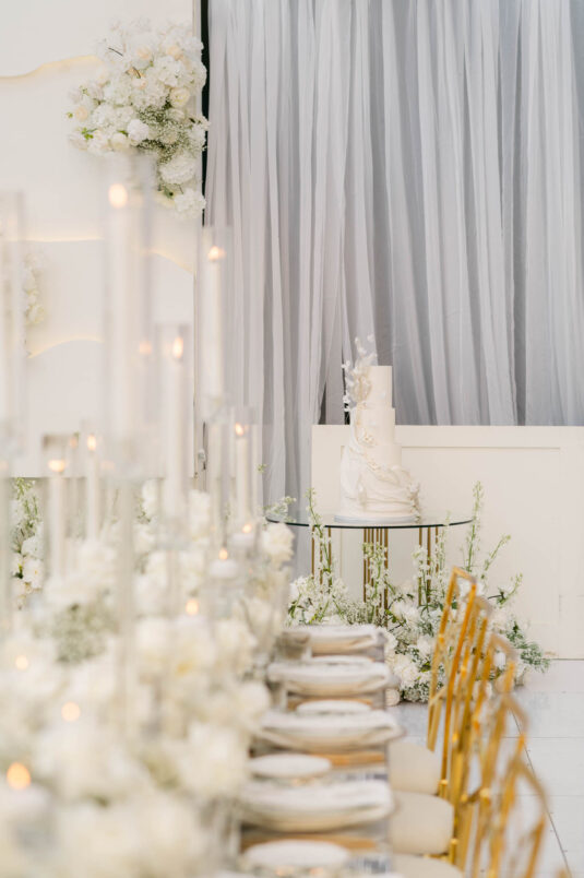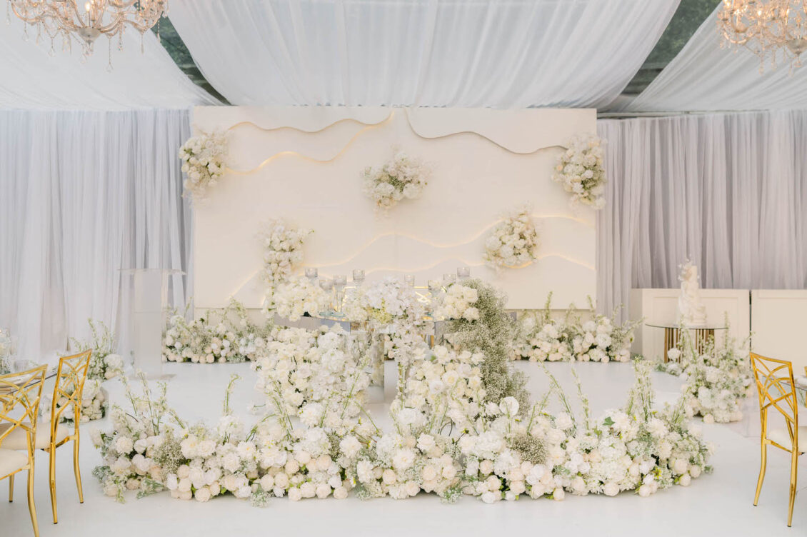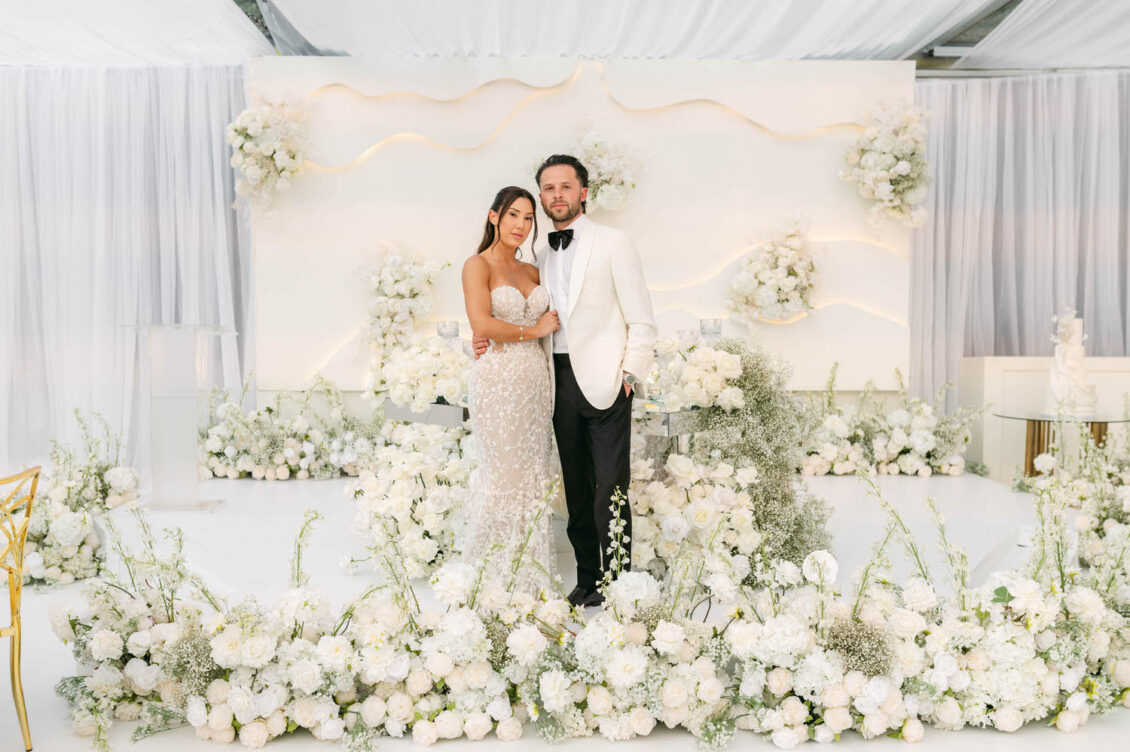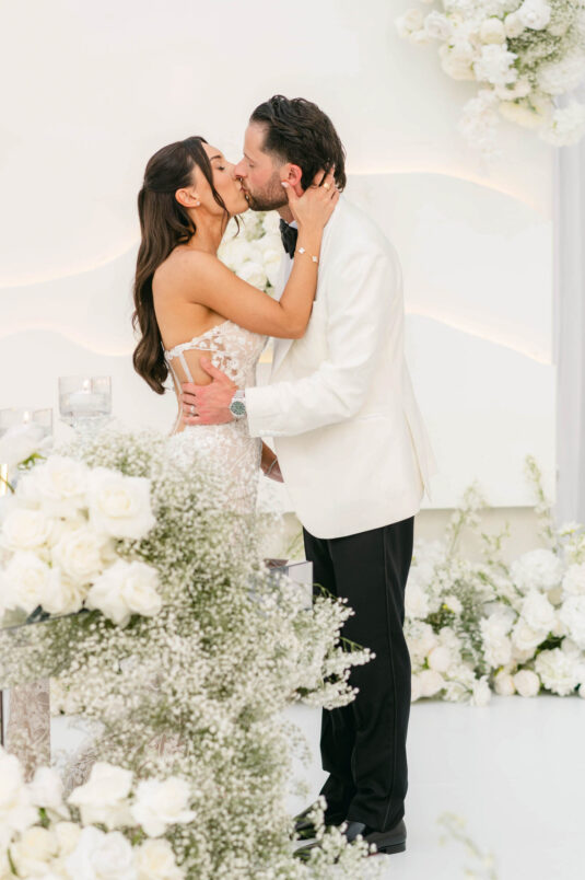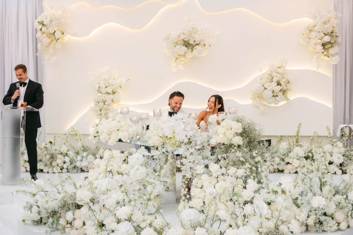 in Toronto. The celebration featured a timeless white palette with rich textures, beautifully enhanced by the floral design of