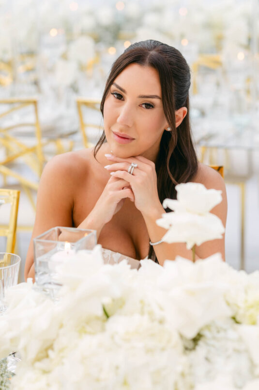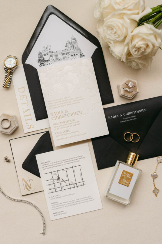 Their wedding day was a seamless blend of elegance and romance. Nadia looked stunning in a custom Galia Lahav gown, purchased from White Toronto, paired with Dior J’Adior slingbacks and a Lady Dior bag gifted by Christopher on the morning of the wedding. Christian Dior proved the perfect choice for gifting bridesmaids too, as Nadia thoughtfully chose Dior bracelets for her bridesmaids and Maids of Honor, a nod to the shared initials “CD” that perfectly tied in with Christopher and Nadia. Christopher complemented her beautifully in a bespoke tuxedo, accessorized with a Rolex Sky-Dweller and cufflinks from his late grandfather.