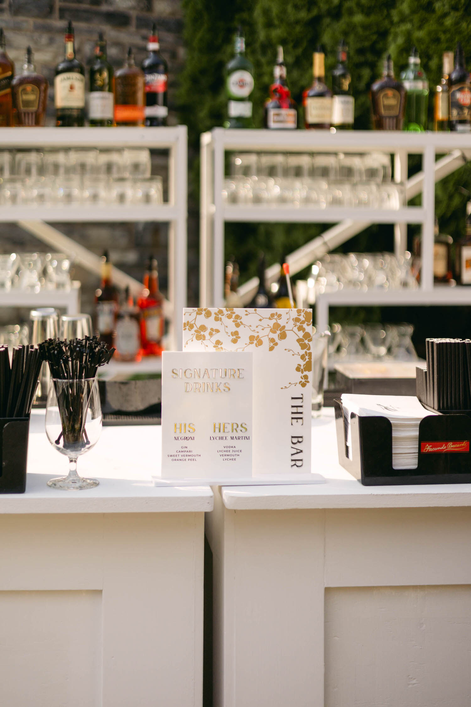 The outdoor bar setup at the Ethereal Casa Loma Wedding features bottles of alcohol on white shelves. A sign in the center displays “Signature Drinks: His & Hers.” Glasses and bar tools are neatly arranged on the counter, surrounded by lush greenery in the background.