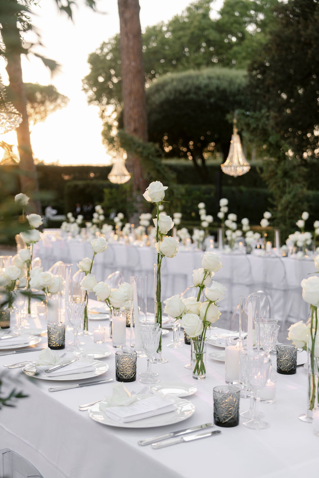 An elegant and glamorous outdoor wedding reception in Rome features long tables adorned with white tablecloths, white rose centerpieces, crystal glassware, and candles. Chandeliers hang from trees, while the setting sun casts a warm glow over this modern celebration.