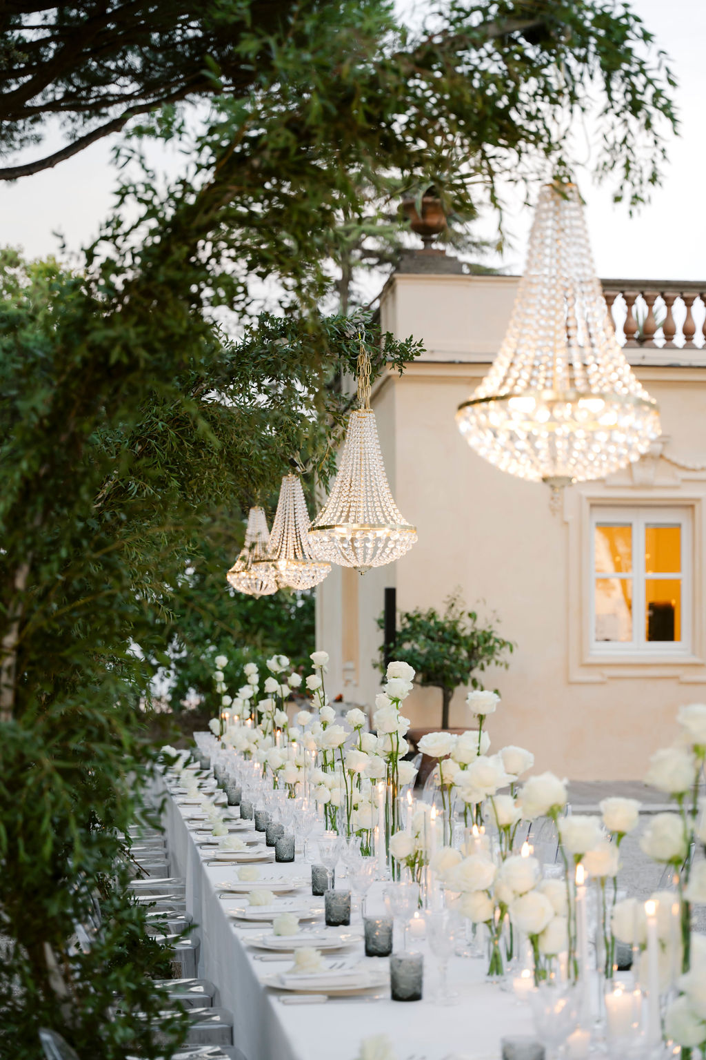 A long, elegantly set dining table outdoors, adorned with white flowers and candles, exudes the charm of a modern and glamorous wedding in Rome. Crystal chandeliers hang overhead from a lush green arch, casting a warm glow. A classical building is visible in the background.