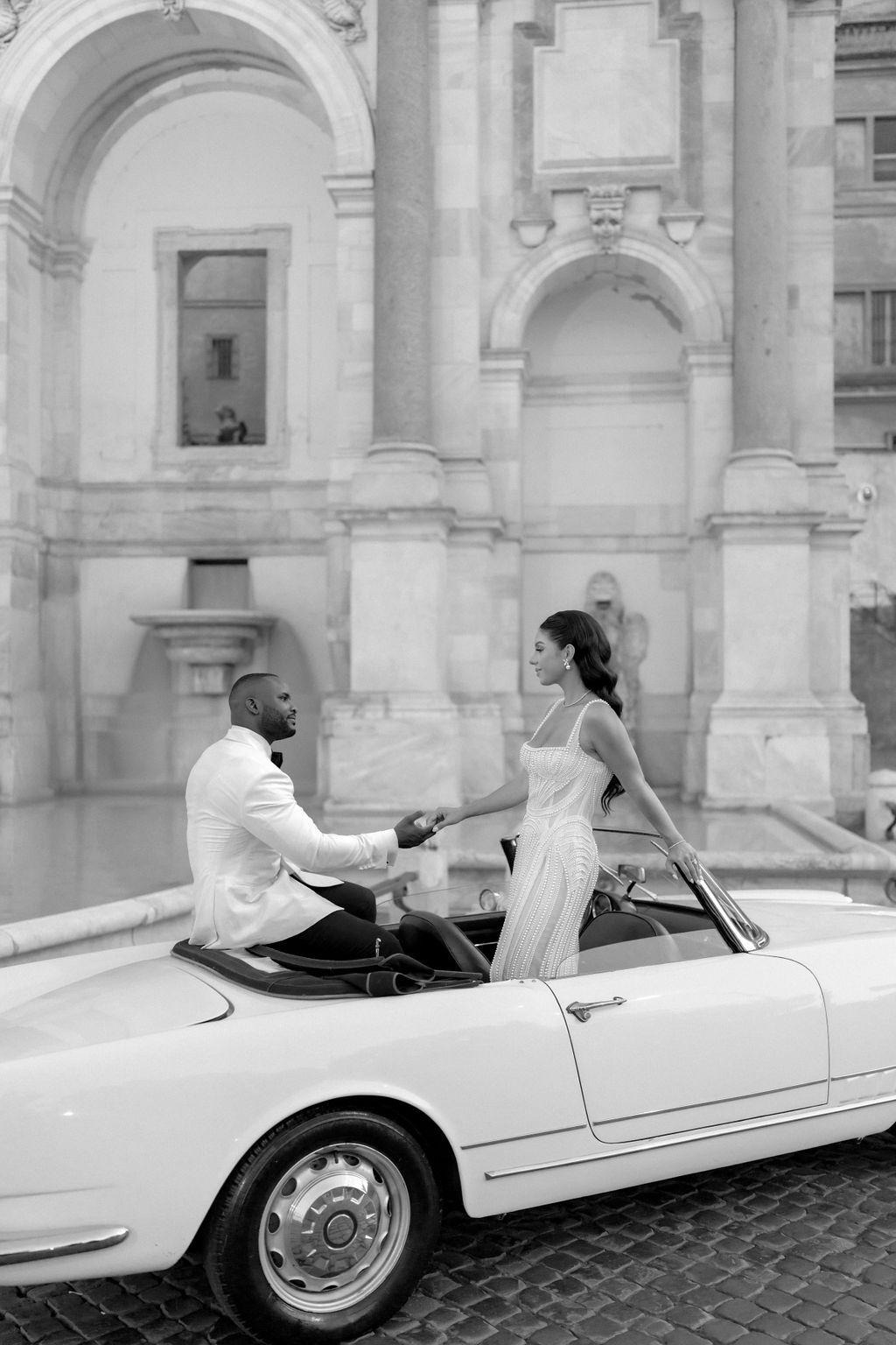 A couple dressed elegantly, with the man in a suit and the woman in a long dress, are sitting on the back of a convertible car. Amidst an ornate architectural backdrop, they hold hands, epitomizing a modern and glamorous wedding in Rome. The image is beautifully captured in black and white.