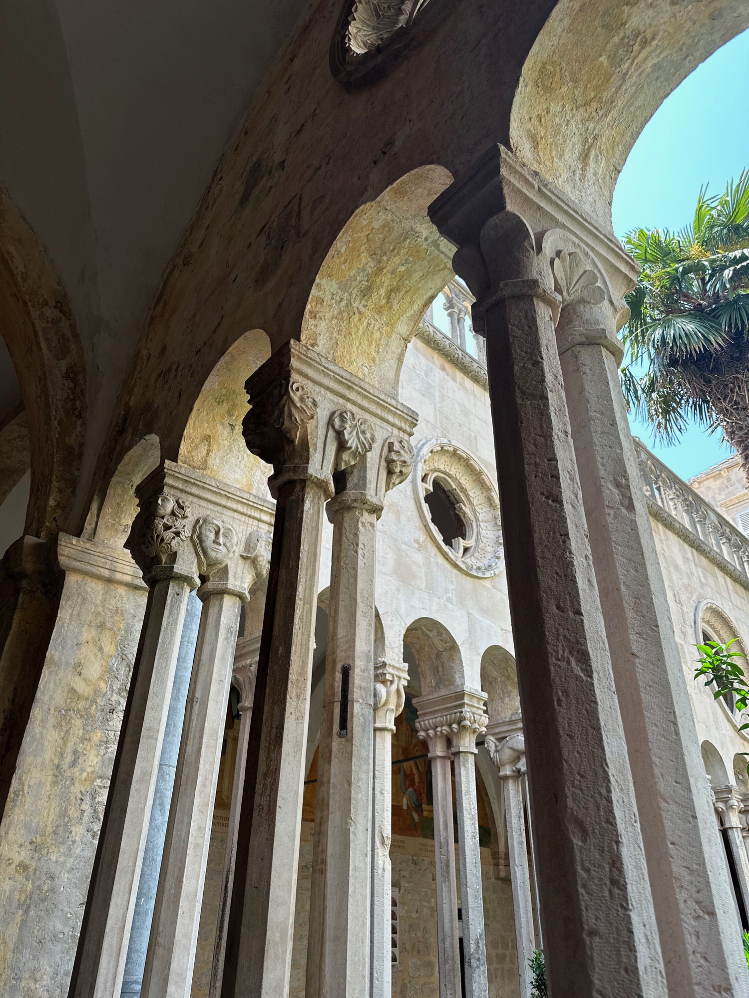 An ultimate escape awaits in this ancient stone cloister with ornate arches and columns, creating a serene, historic atmosphere. Sunlight filters through, highlighting architectural details and casting shadows on the aged walls. A glimpse of greenery is visible in the background.