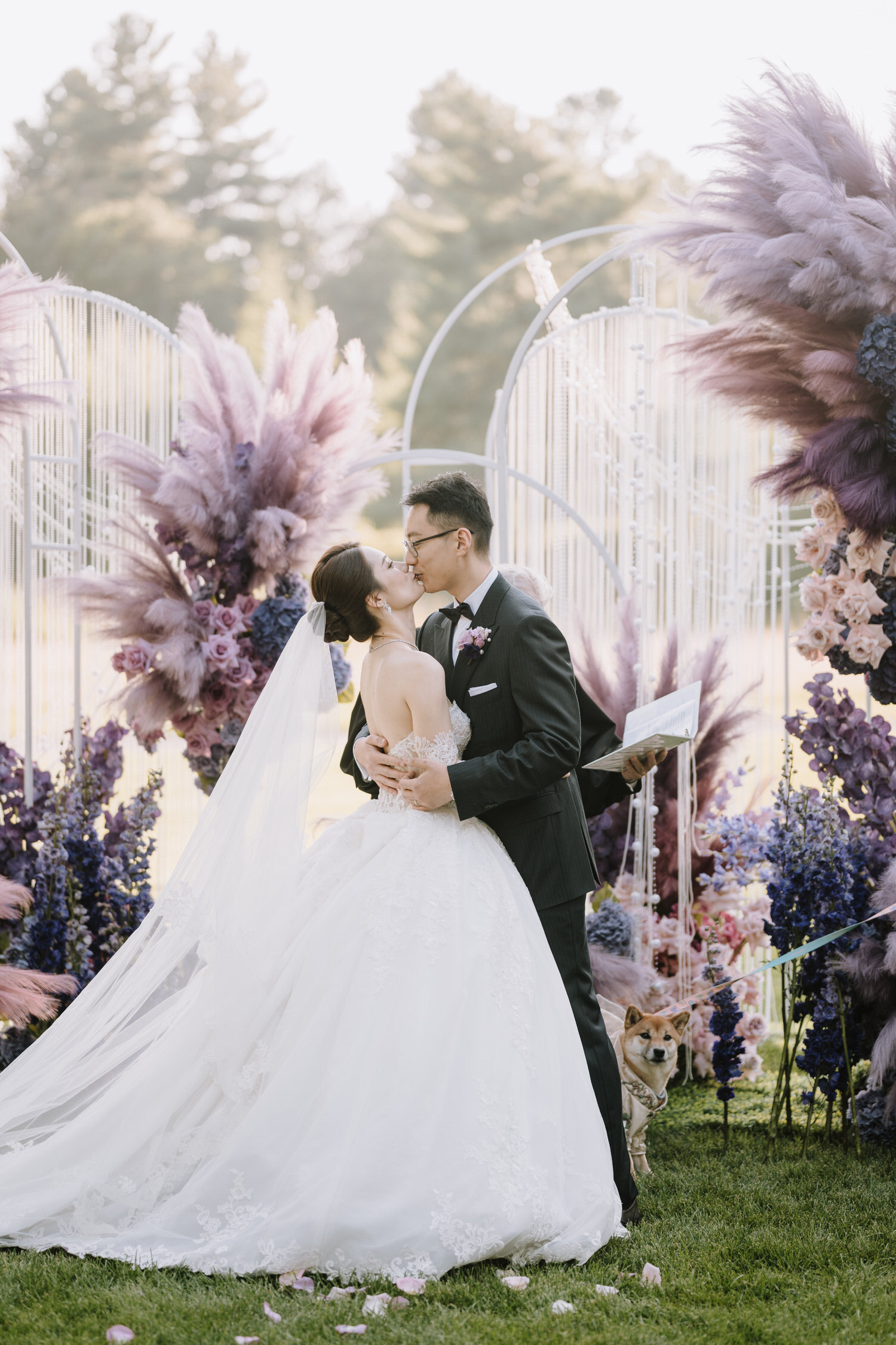 A bride and groom share a loving kiss at their Harry Potter and Great Gatsby-inspired outdoor wedding. The bride dazzles in her flowing white gown and veil, while the groom looks dapper in a dark suit, surrounded by tall, colorful blooms. Nearby, a small dog adds charm to this enchanting scene.