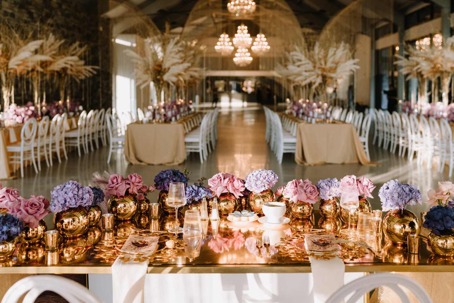 A luxurious banquet hall setup with elegant long tables adorned with gold vases and pastel flowers, including pink and purple blooms. Chandeliers hang above, while white chairs line the hall, evoking a sophisticated Harry Potter and Great Gatsby-inspired wedding atmosphere.