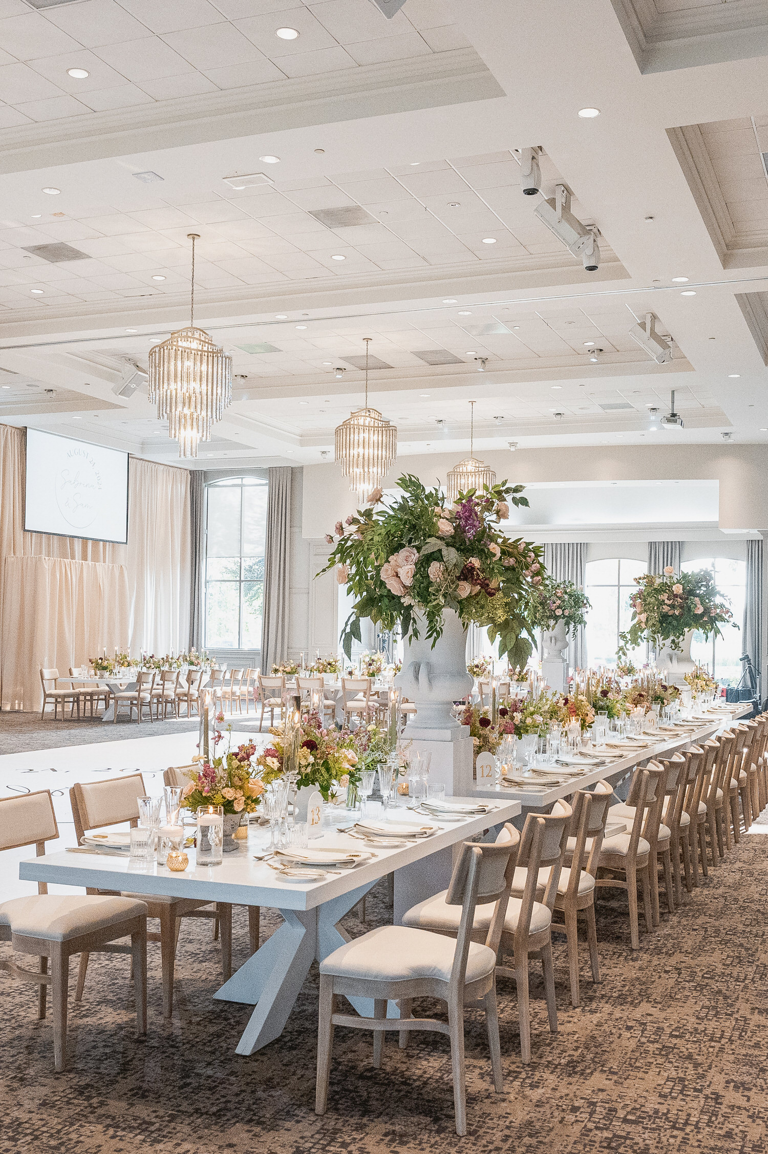 A beautifully decorated banquet hall with a long table set for a wedding reception exudes summer elegance. The table features elegant white linens, floral centerpieces, and neatly arranged chairs. Chandeliers hang from the ceiling, while large windows let in natural light.
