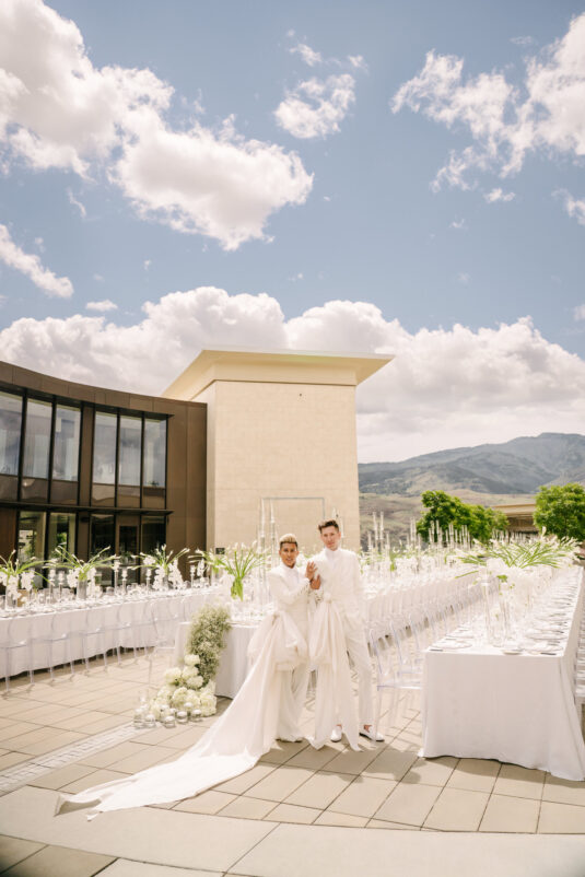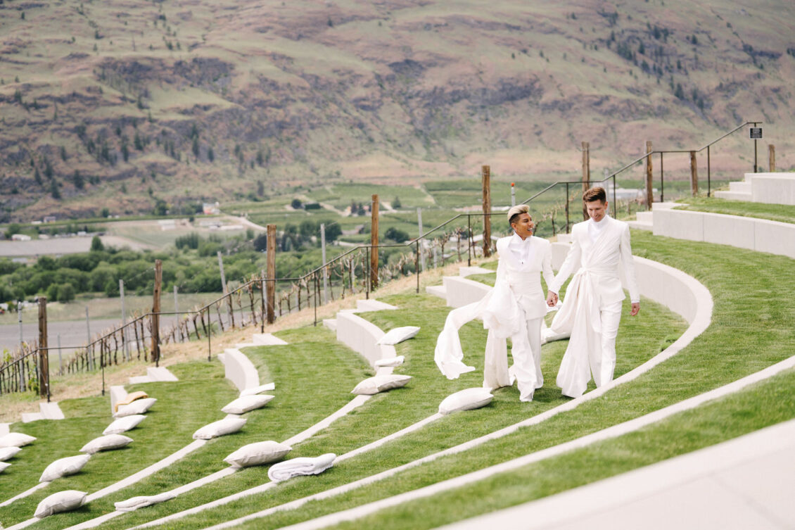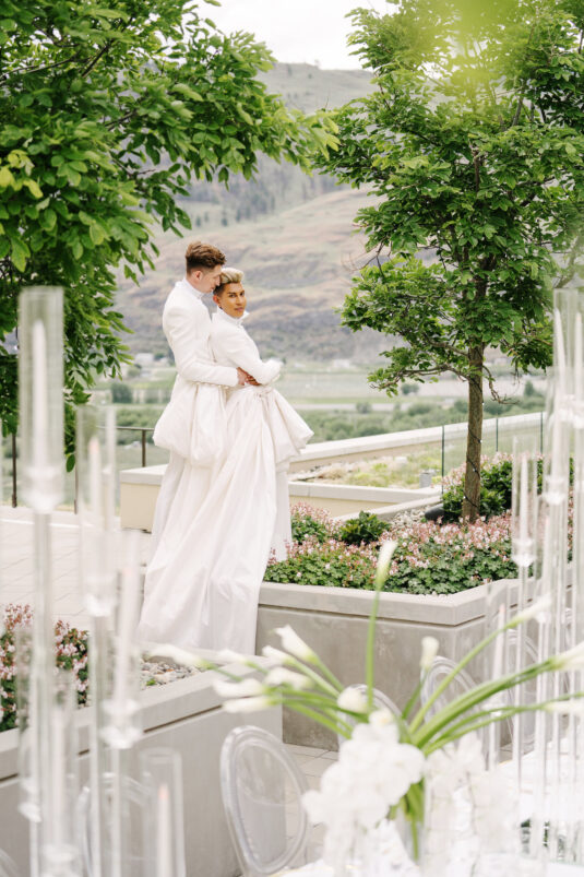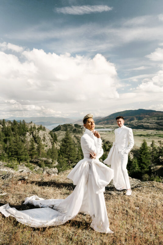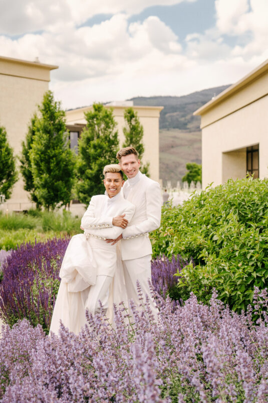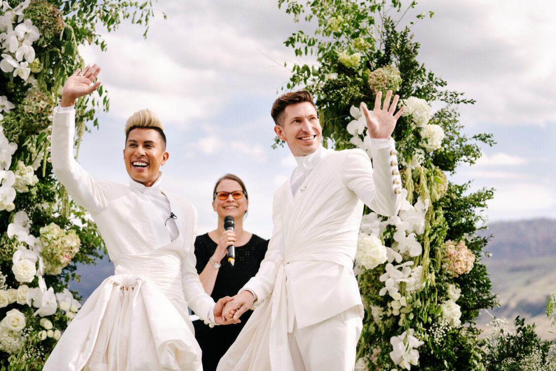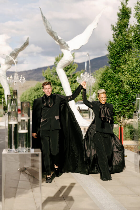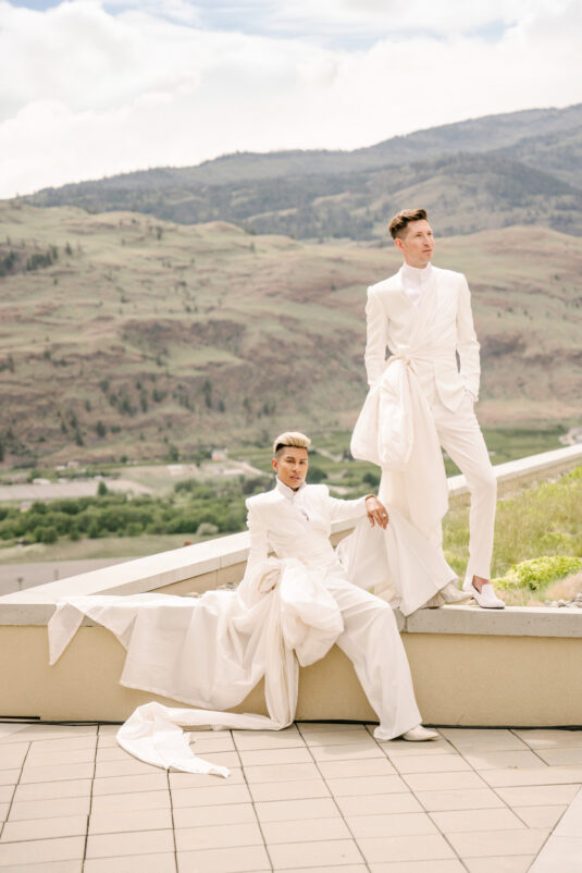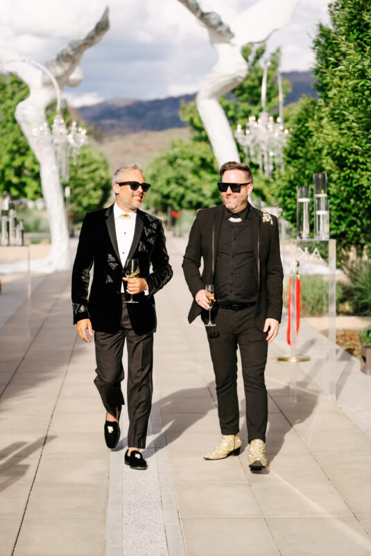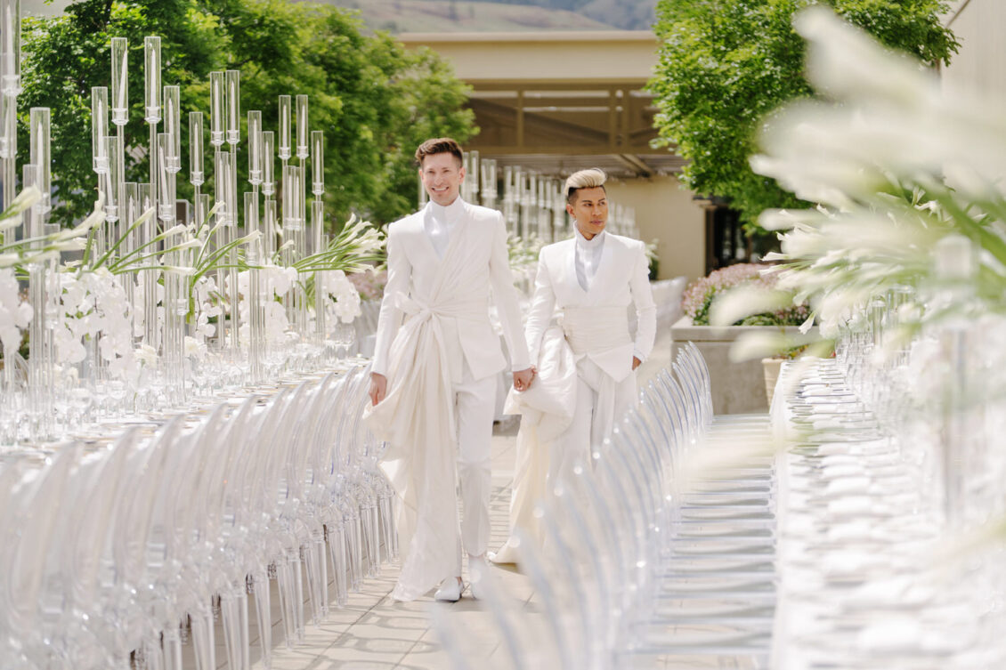 to orchestrate a unique celebration that would challenge and redefine “traditional” wedding norms. The high-fashion celebration was held over a three-day weekend in British Columbia’s Okanagan Valley, with the ceremony and reception at Phantom Creek Estates Winery. The fashion-forward couple commissioned Denis Gagnon, a renowned couturier, to create three distinct ensembles for each groom—18 pieces in total—featuring removable elements for versatility.