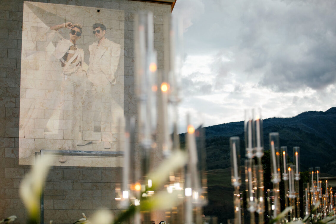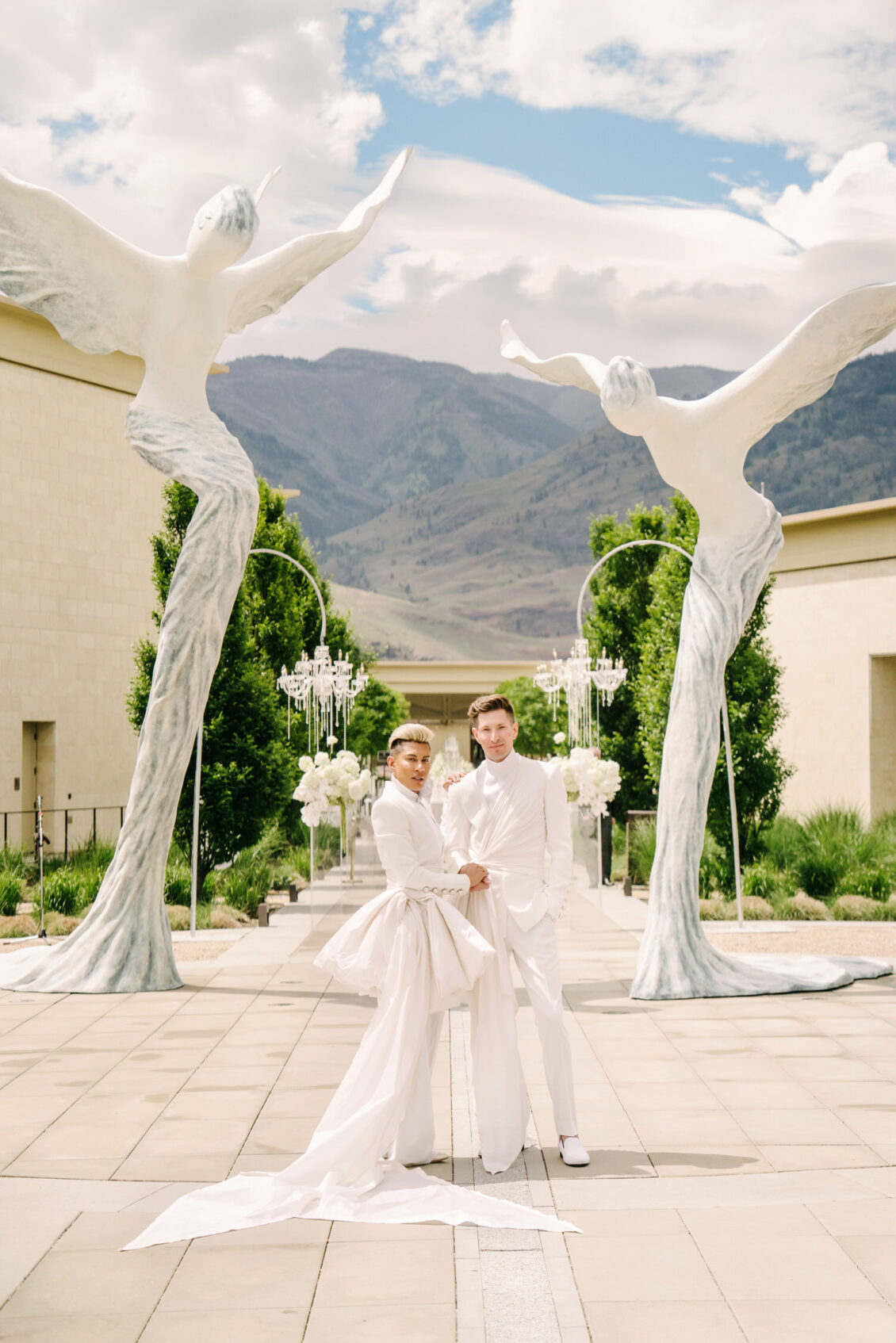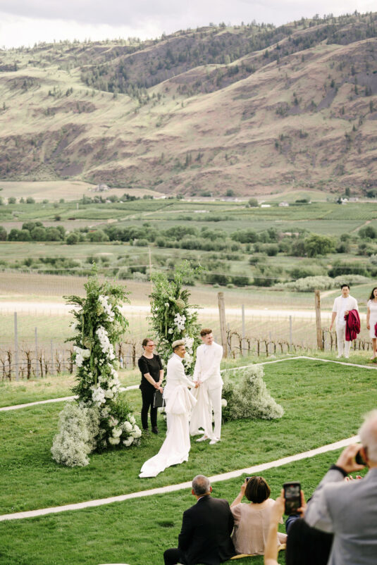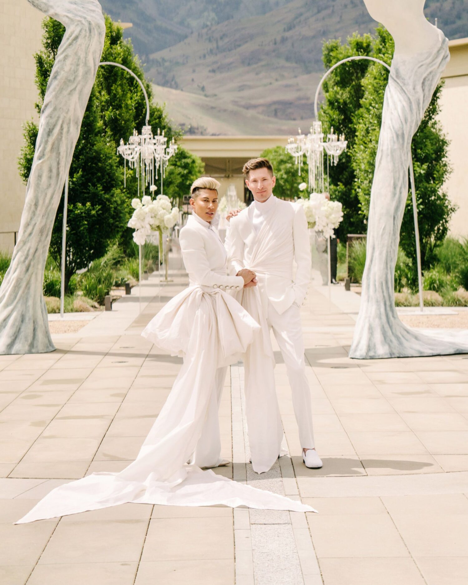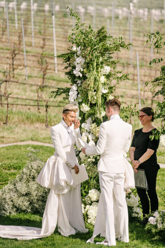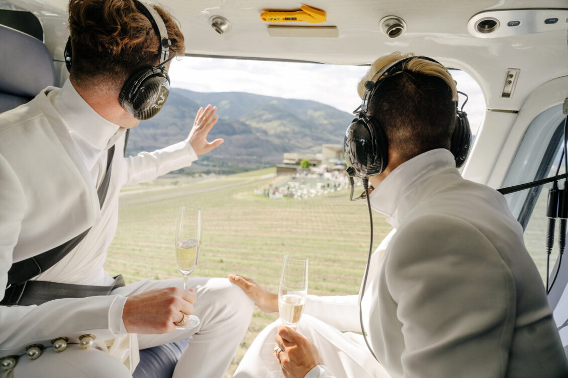 to orchestrate a unique celebration that would challenge and redefine “traditional” wedding norms. The high-fashion celebration was held over a three-day weekend in British Columbia’s Okanagan Valley, with the ceremony and reception at Phantom Creek Estates Winery. The fashion-forward couple commissioned Denis Gagnon, a renowned couturier, to create three distinct ensembles for each groom—18 pieces in total—featuring removable elements for versatility.