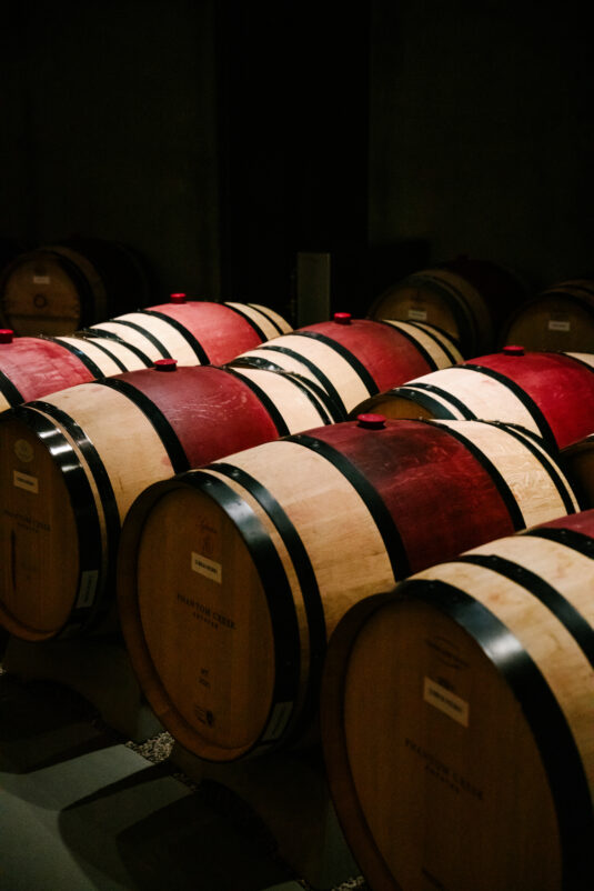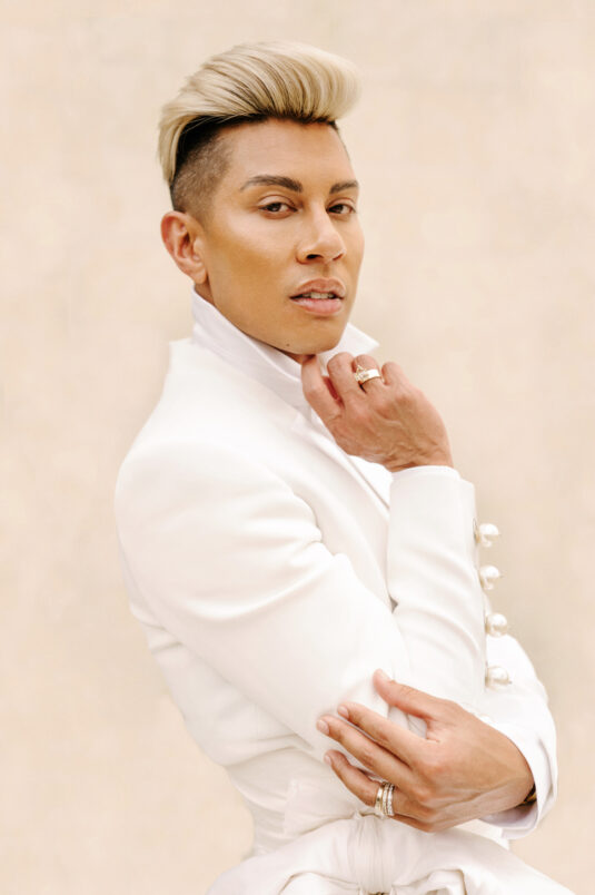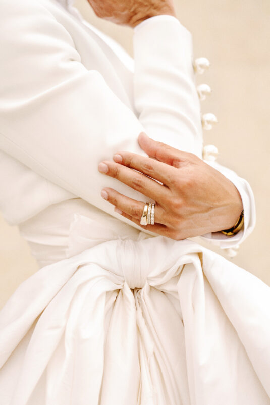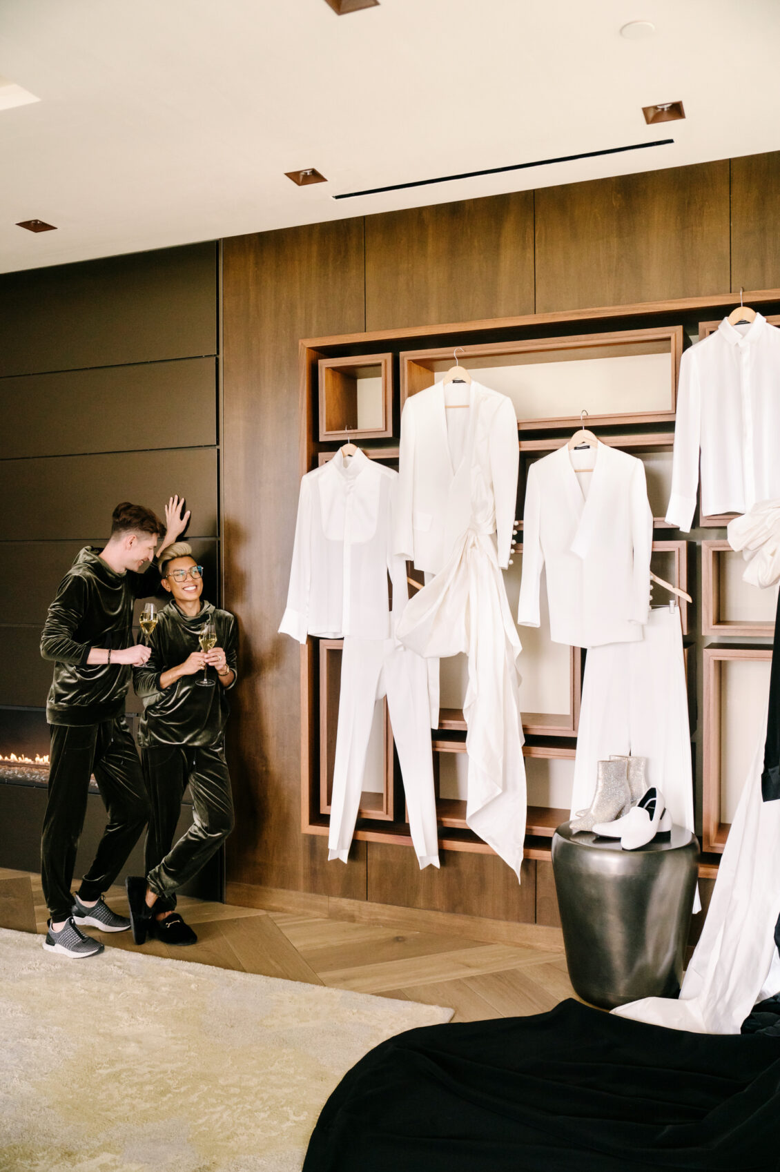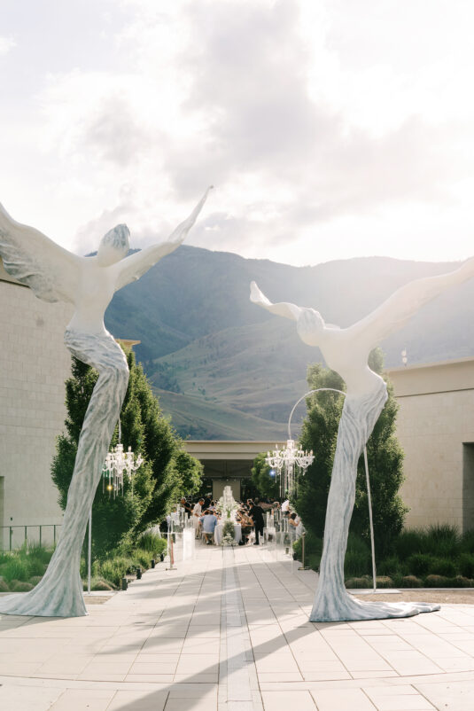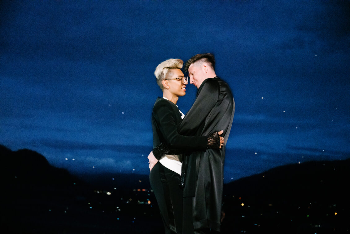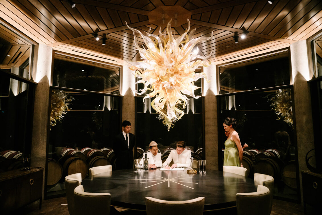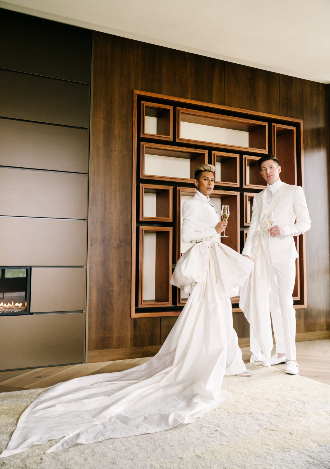 to orchestrate a unique celebration that would challenge and redefine “traditional” wedding norms. The high-fashion celebration was held over a three-day weekend in British Columbia’s Okanagan Valley, with the ceremony and reception at Phantom Creek Estates Winery. The fashion-forward couple commissioned Denis Gagnon, a renowned couturier, to create three distinct ensembles for each groom—18 pieces in total—featuring removable elements for versatility.