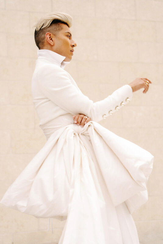 Aleem and Victor designed their wedding looks to be timeless and adaptable, featuring mixed textiles and bold hardware.
