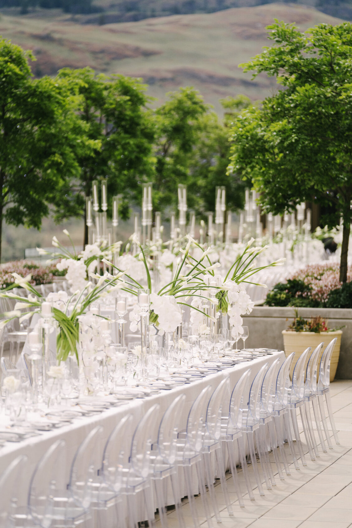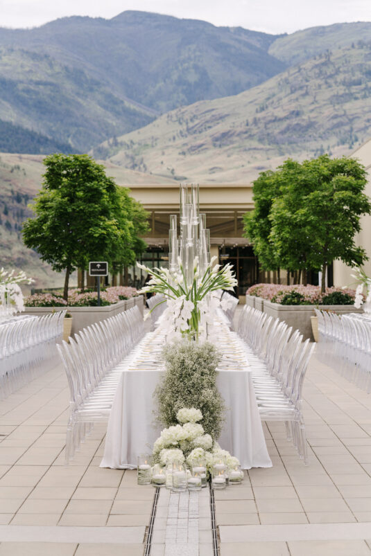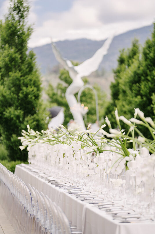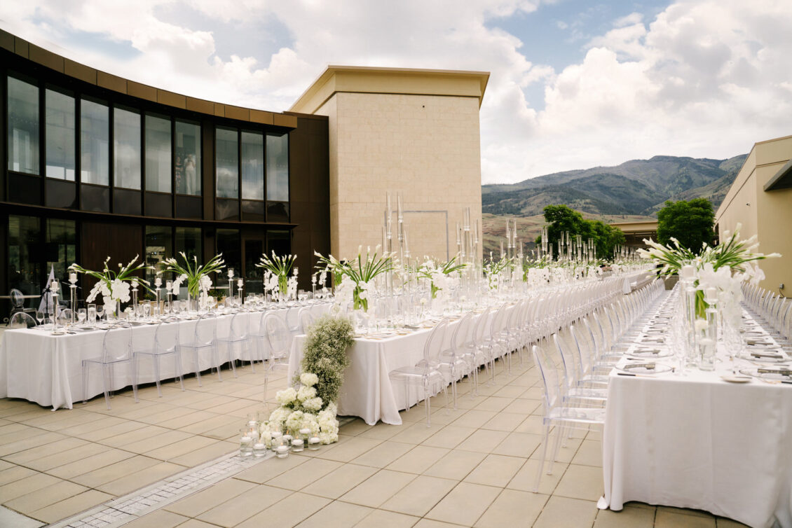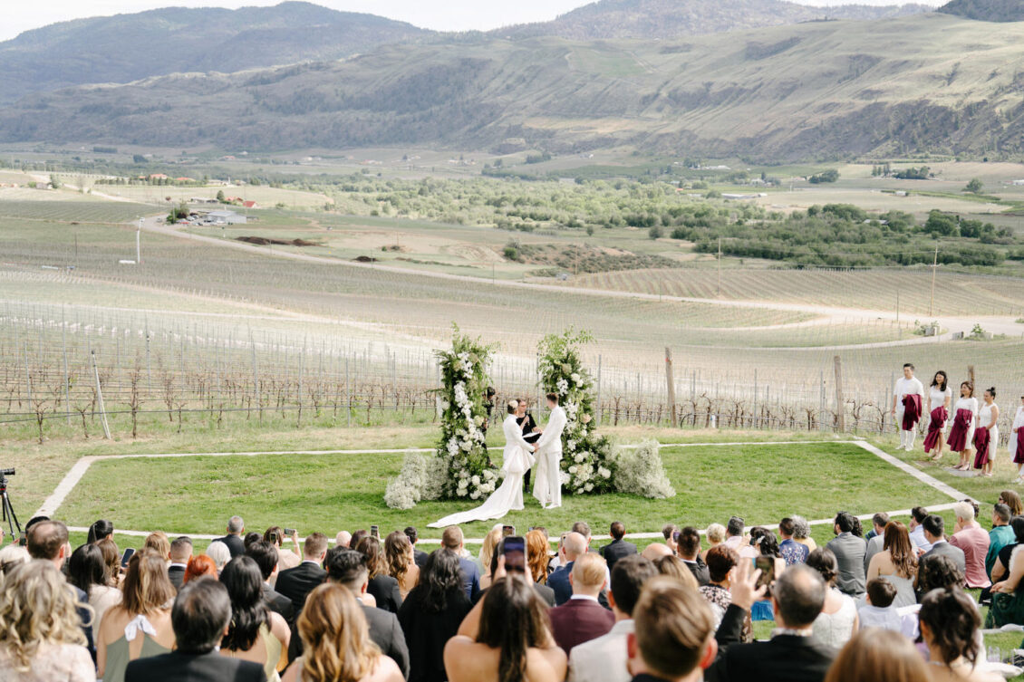 Aleem and Victor’s three-day wedding weekend was a momentous celebration that kicked off both the wedding season and Pride Month globally. The main event on Saturday, June 1, 2024, took place at the iconic Phantom Creek Estates Winery in British Columbia’s Okanagan Valley. The day was defined by three key principles: transformation, fluidity, and reimagination—concepts that shaped both the wedding and the fashion.