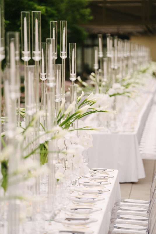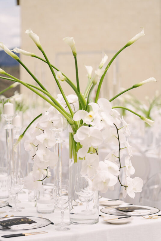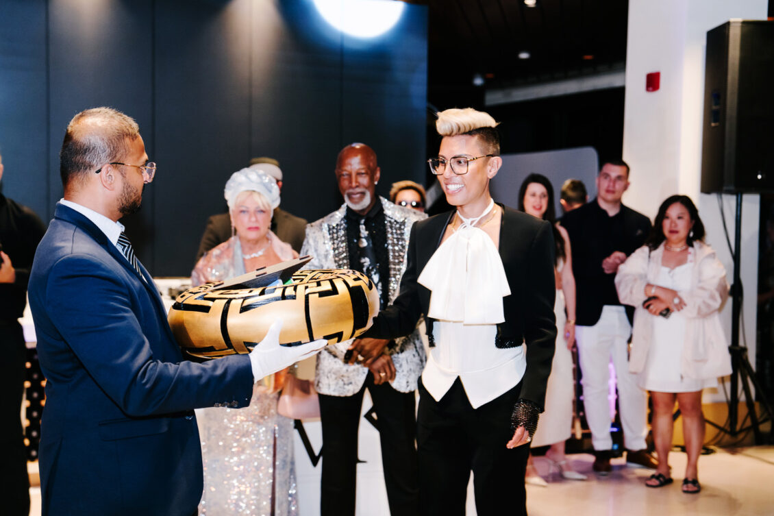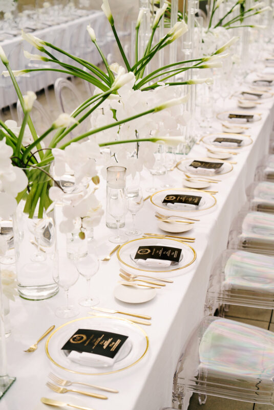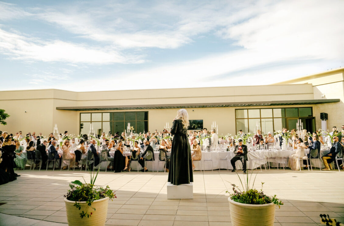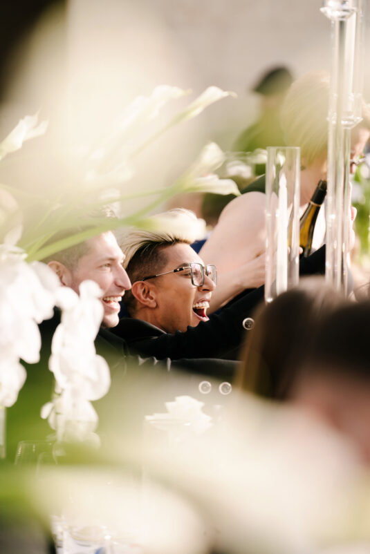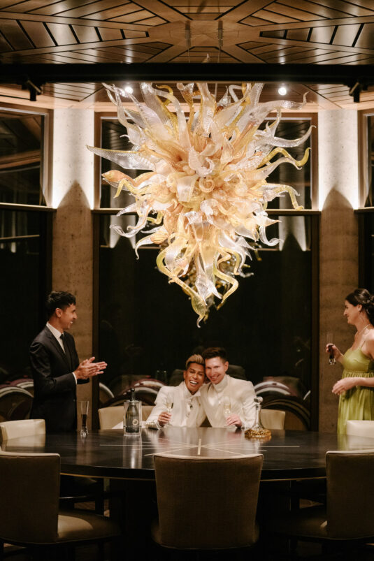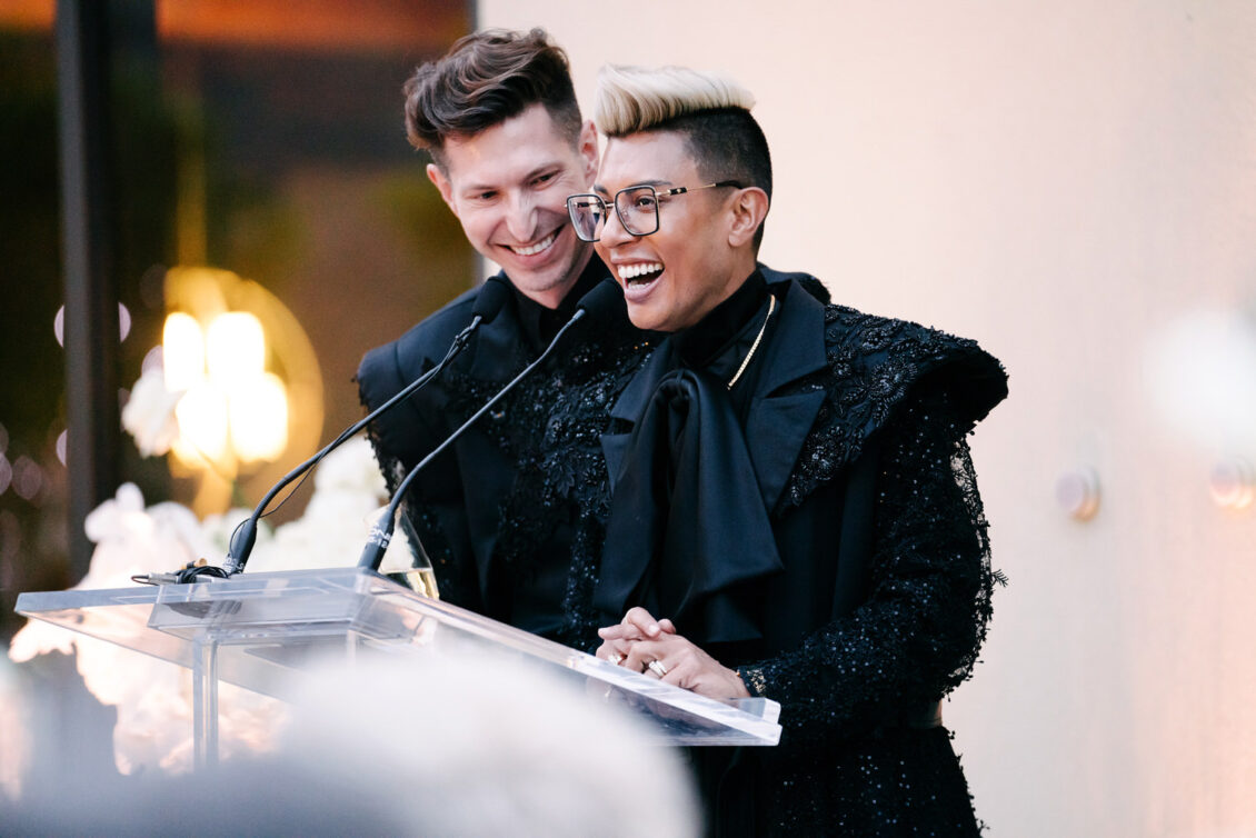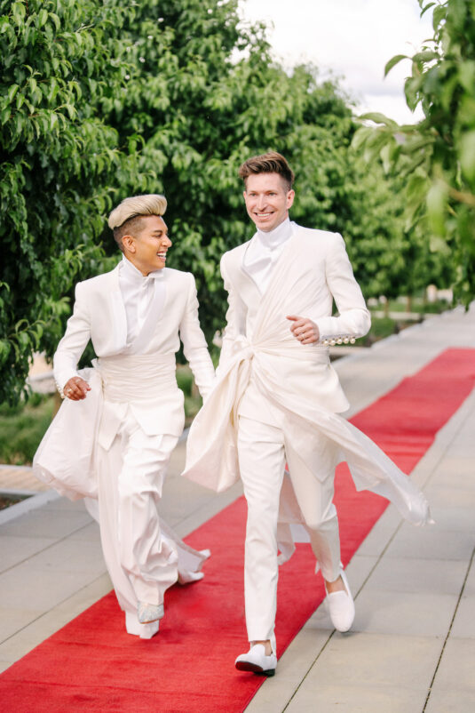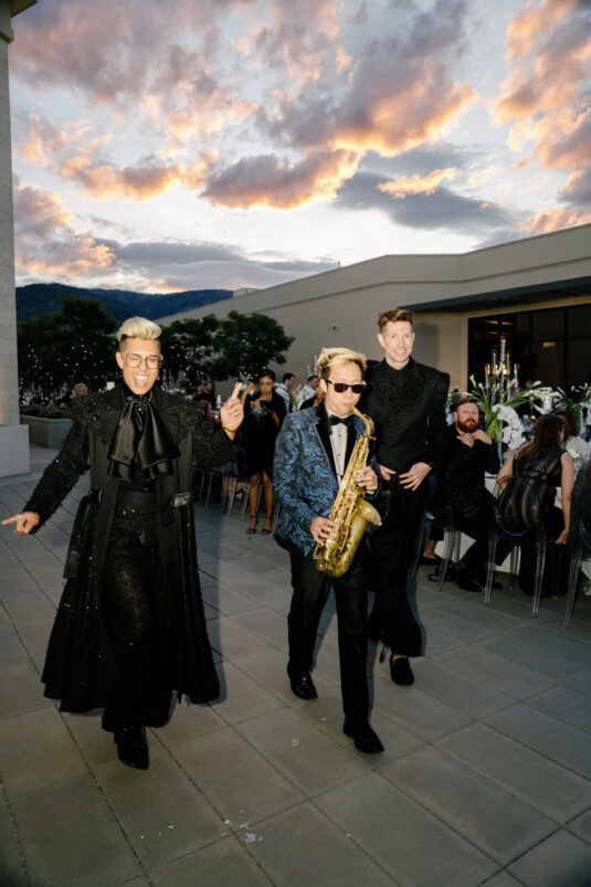 The grooms dazzled in four couture looks each, while guests embraced the “Met Gala” theme with their most fabulous attire. Grand gestures, such as a helicopter whisking the couple away, were paired with over-the-top glamour, fashion, and entertainment—all while leaving pretentiousness at the door.