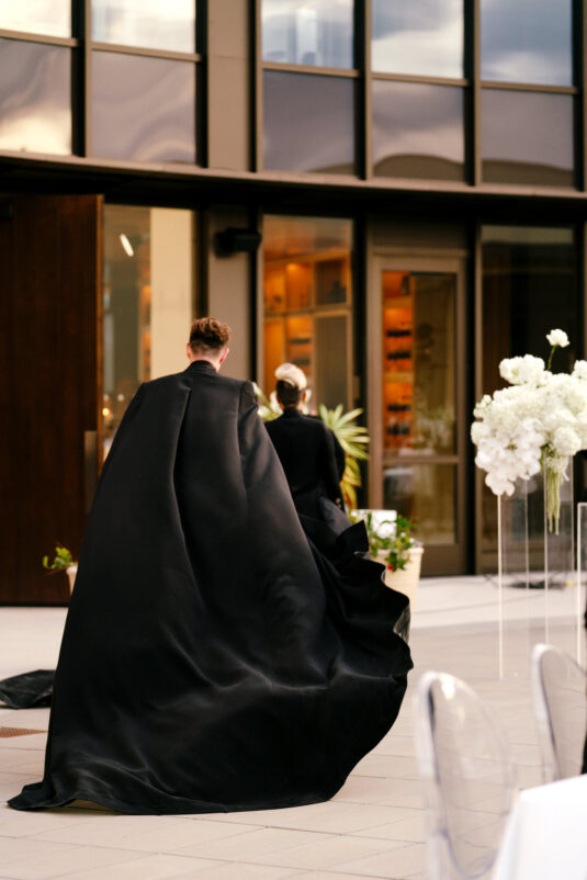 Before the reception, the grooms debuted bold second looks by Denis Gagnon, featuring detachable capes and skirts for dramatic flair and comfort.