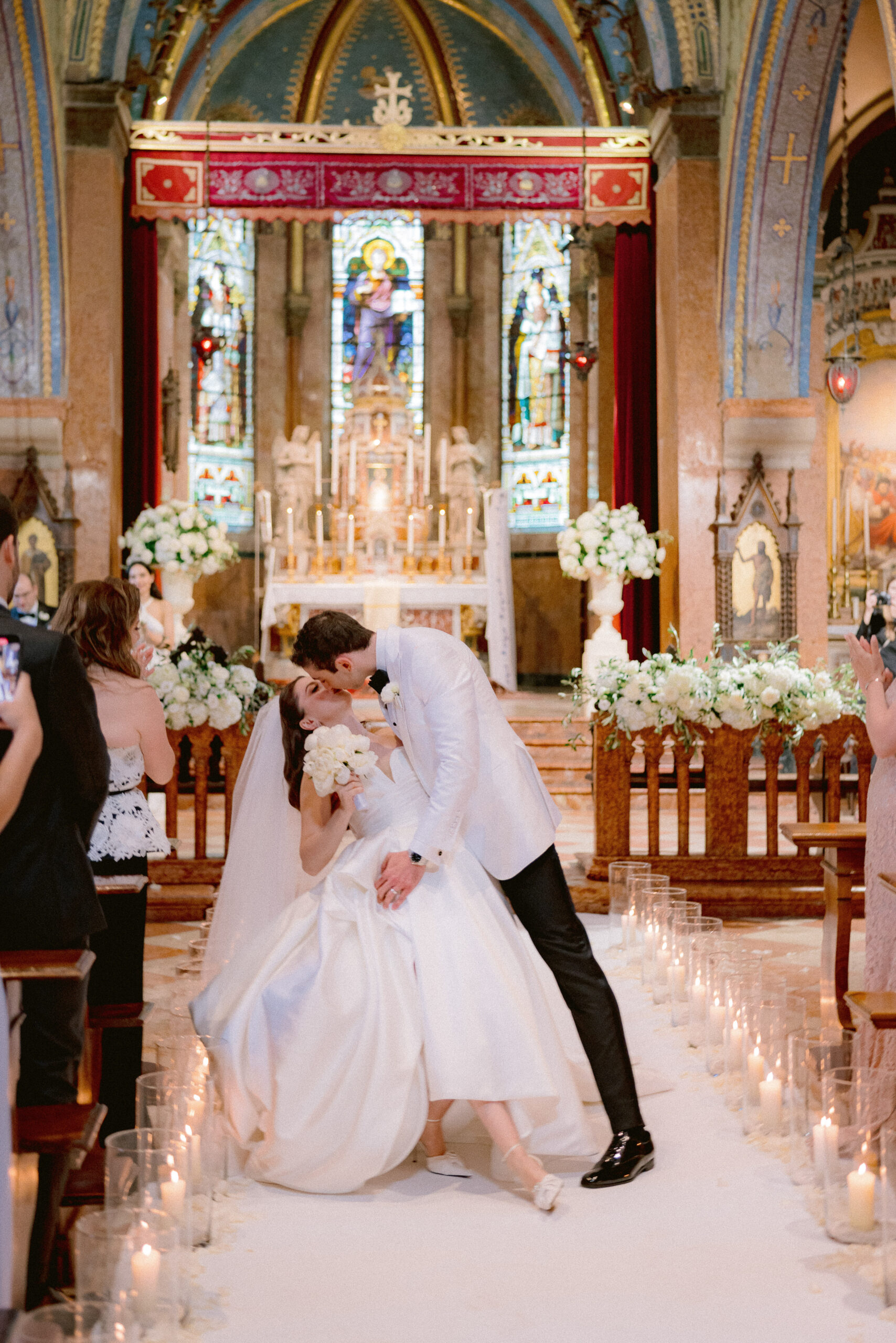 In a Venice destination wedding, a bride and groom share a kiss in the church aisle, surrounded by candles and flowers. The groom wears a white suit, and the bride is in a white gown with a veil. Stained glass windows and an ornate altar are in the background as guests capture photos.