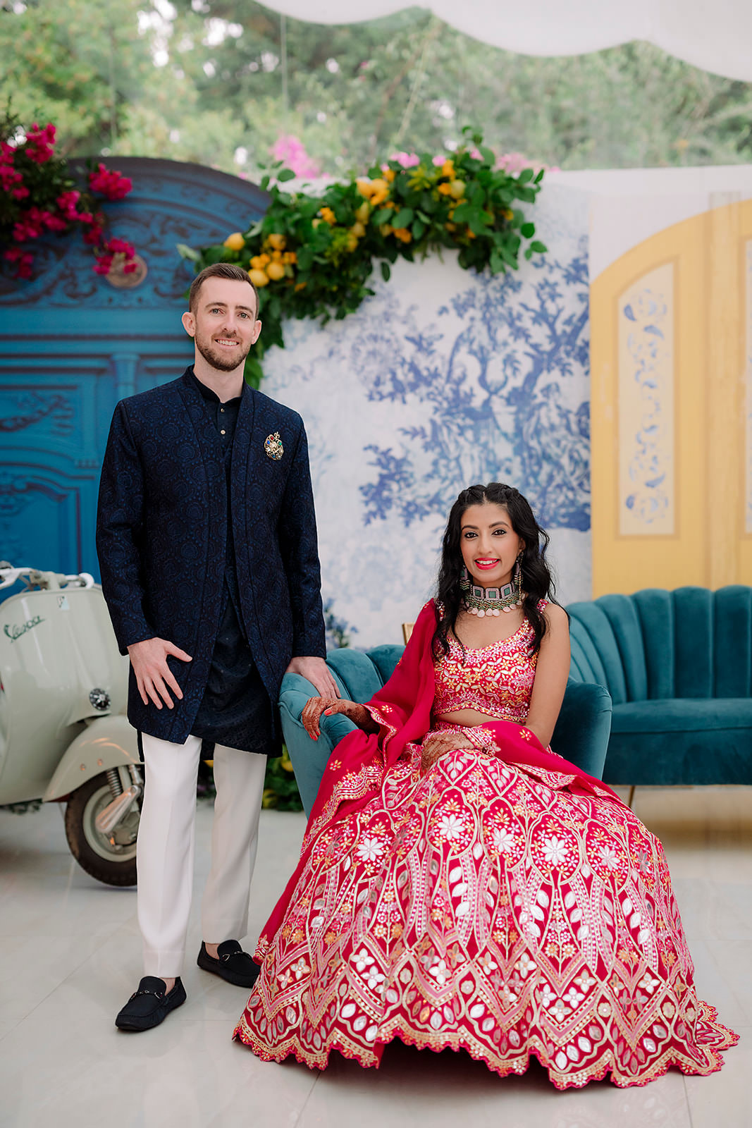 A couple poses in formal attire, evoking a Roman fairytale. The man wears a dark suit with white pants, while the woman dazzles in a vibrant pink and white embroidered gown. They stand indoors with a blue couch, floral backdrop, and scooter as part of the enchanting decor.