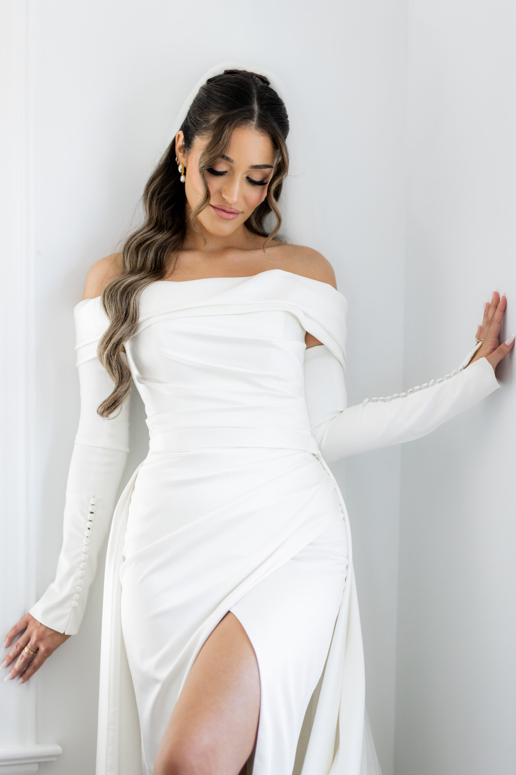 A woman stands against a white wall in Old Montreal, wearing an elegant off-the-shoulder white dress reminiscent of an Old-Hollywood wedding, with long sleeves and a thigh-high slit. Her hair is styled in loose waves, and she gazes down with a soft smile.