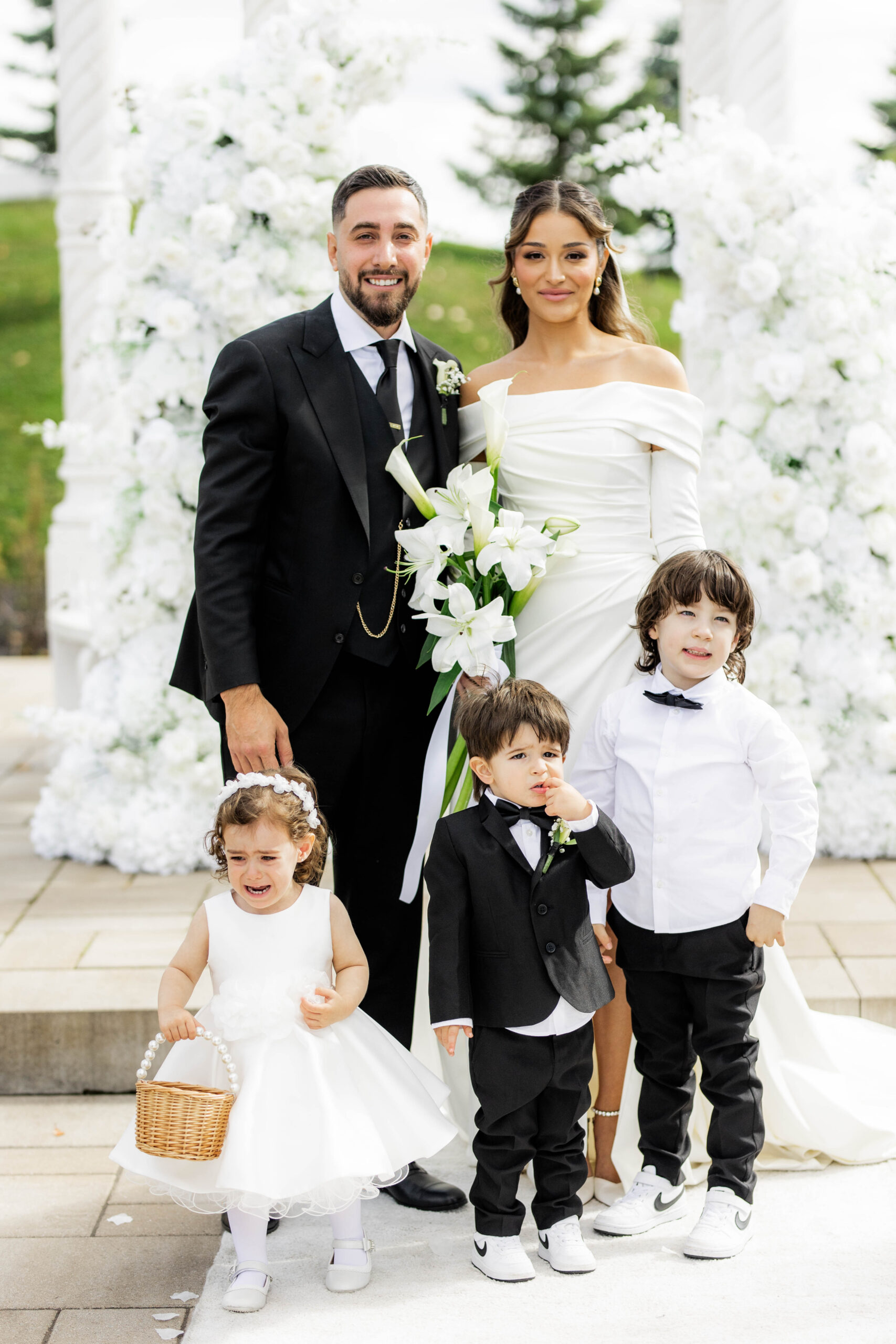 A couple in formal attire stands before a floral arch reminiscent of an Old-Hollywood wedding scene, accompanied by three children. The man is in a black suit, and the woman in a white dress clutches a bouquet. Two boys sport suits, while the girl in a white dress holds a basket, capturing timeless elegance.