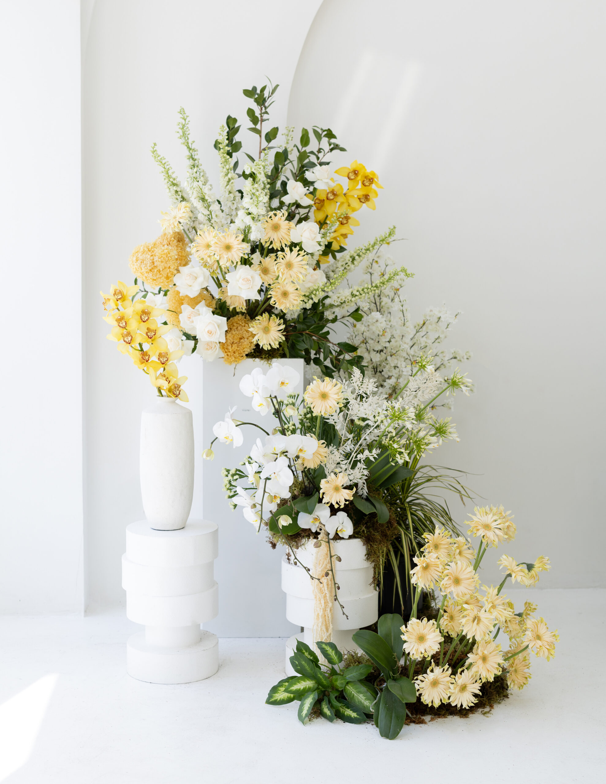 An elegant floral arrangement featuring white roses, butter yellow orchids, white lilies, and daisies graces a minimalist space. Set in modern geometric vases amid lush green leaves, this display captures the essence of the wedding trend for 2025.