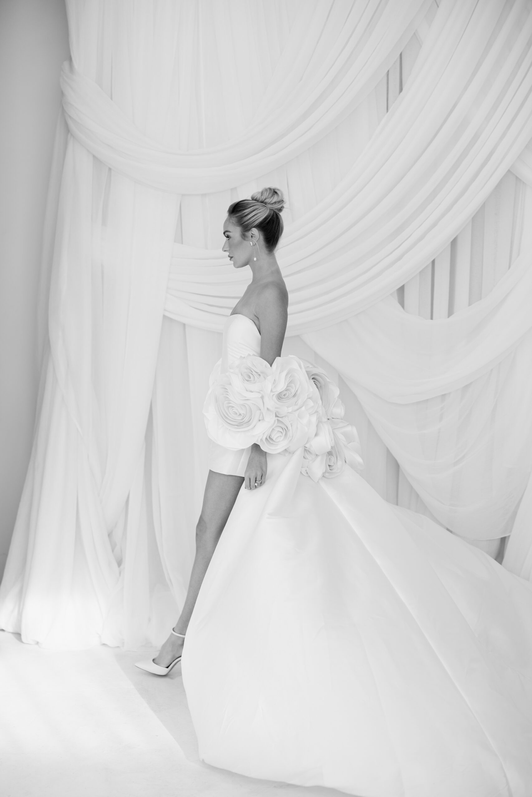 A woman in an elegant off-shoulder wedding dress stands in profile, showcasing the 2025 butter yellow wedding trend. The dress features large floral embellishments and a long flowing train. Her hair is styled in an updo, complemented by high heels. Draped curtains form the background of this black and white image.