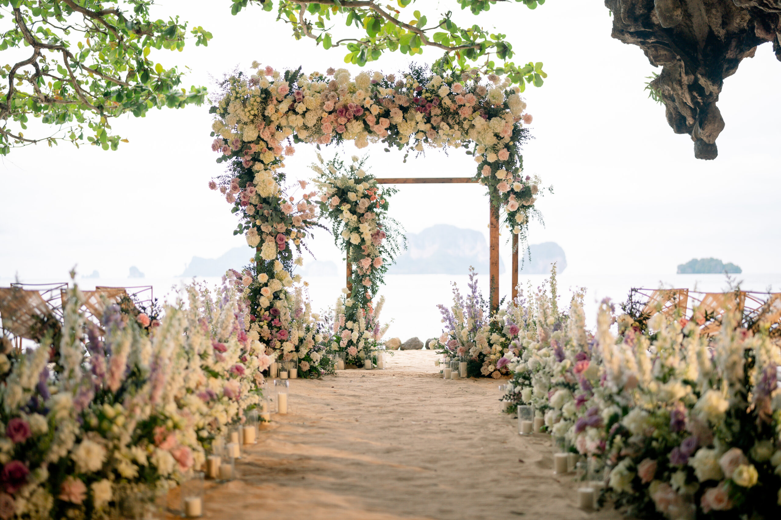 A beach wedding aisle, Disney-inspired, features lush floral arrangements in pastel colors leading to a wooden arch adorned with flowers. The sea and distant islands serve as a magical backdrop under an overcast sky.