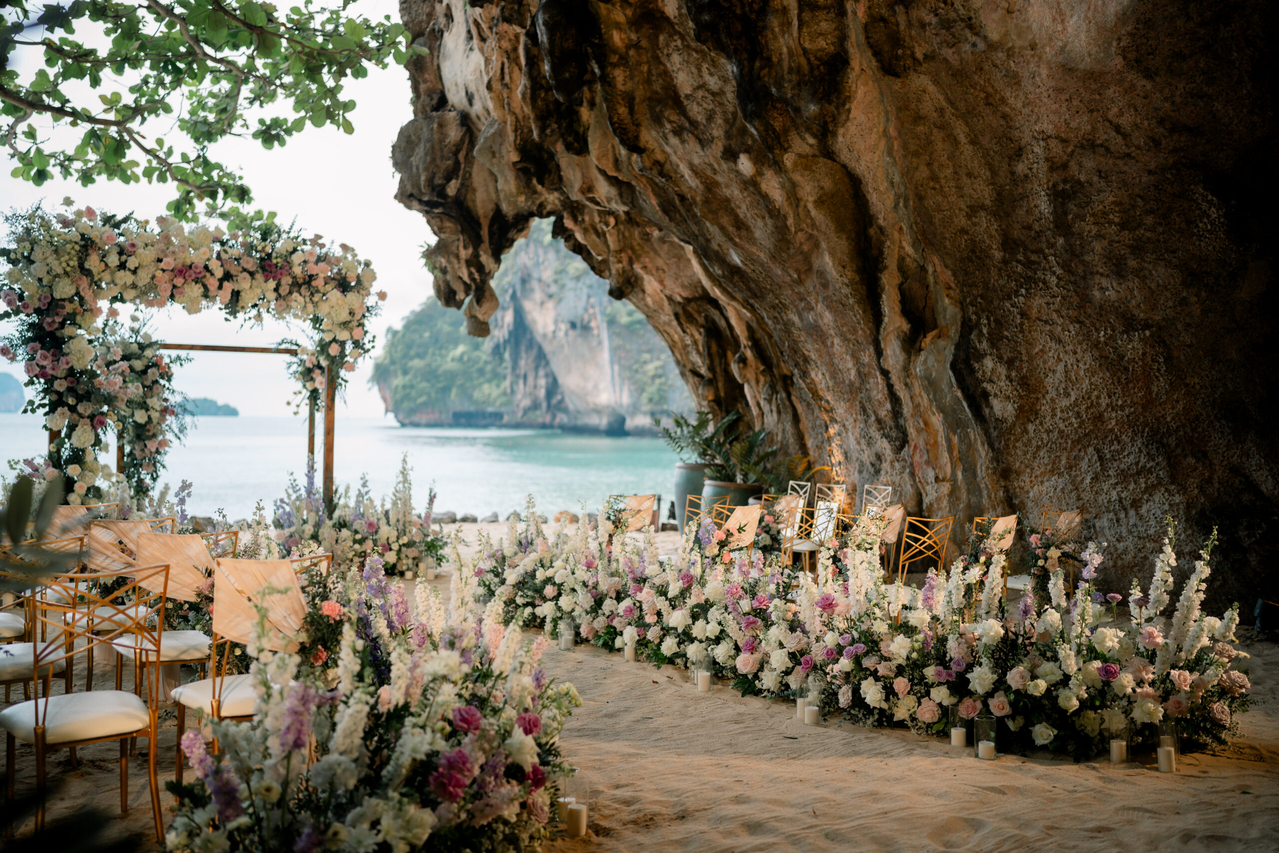 A Disney-inspired beach wedding setup with chairs and floral arrangements under a rocky cliff. An arch adorned with flowers stands near the ocean. The scene features lush greenery and colorful blooms, creating a romantic and picturesque coastal atmosphere.