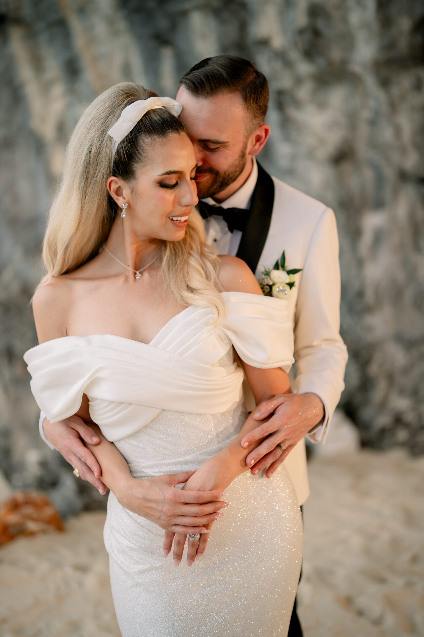 A groom in a white tuxedo embraces a smiling bride in a white off-shoulder gown, holding her hands. They are standing on a sandy surface with a rocky background, creating the perfect setting for their Disney-inspired wedding.