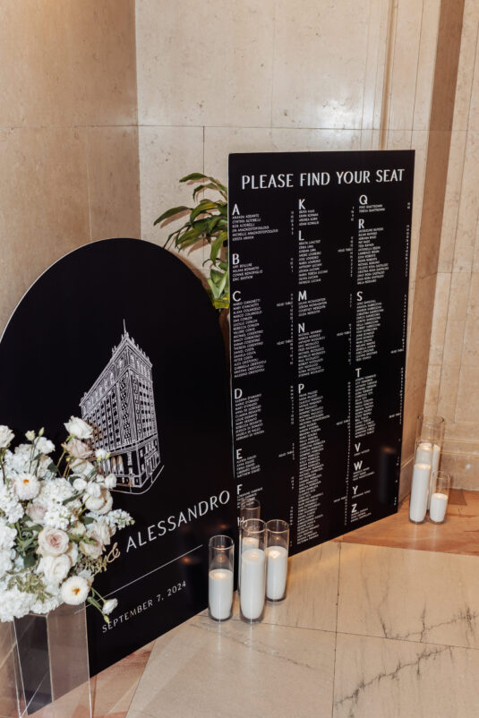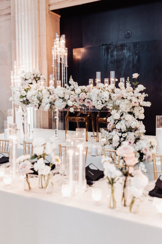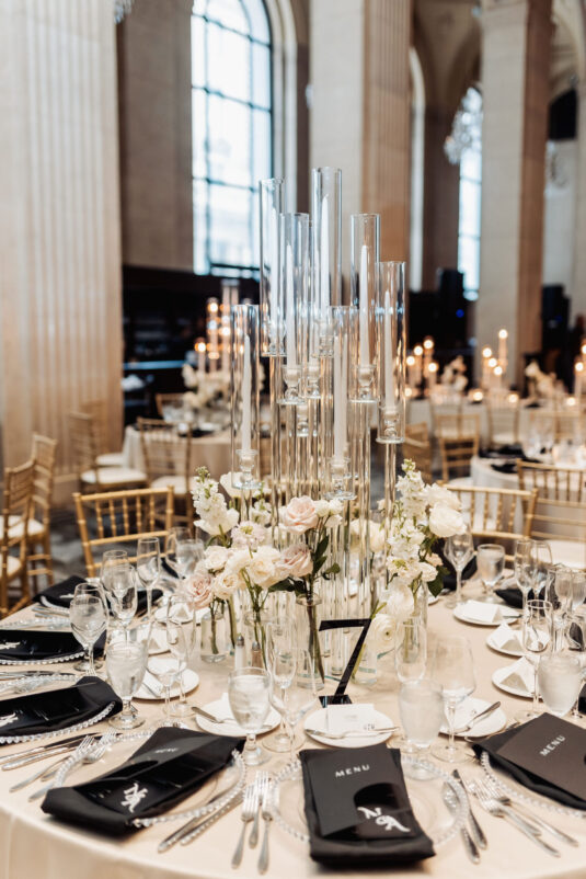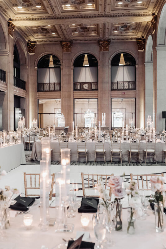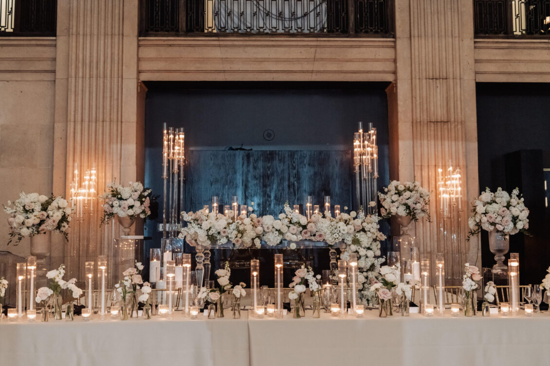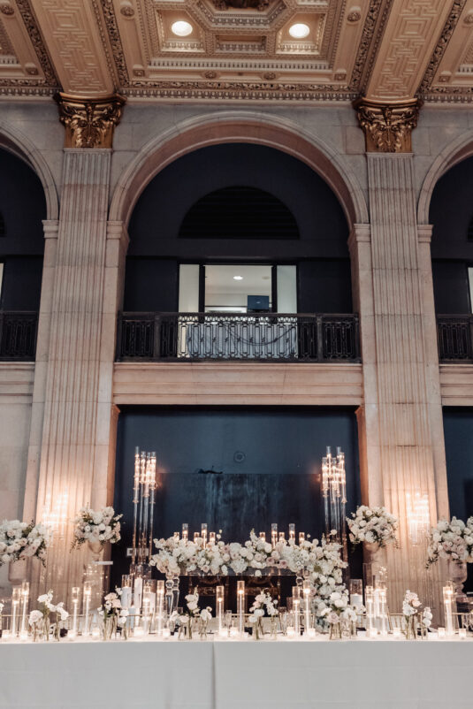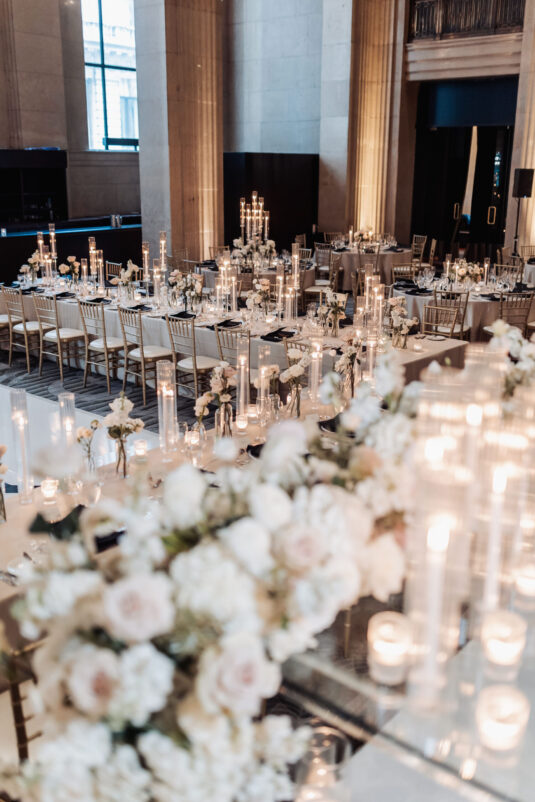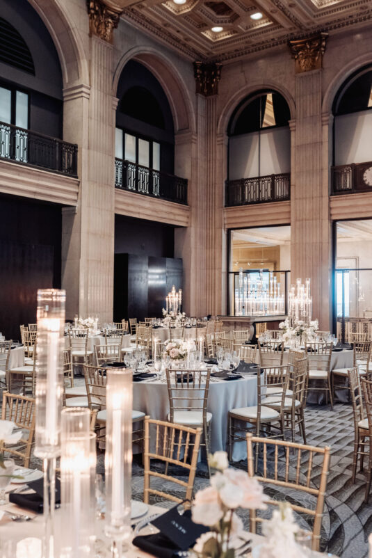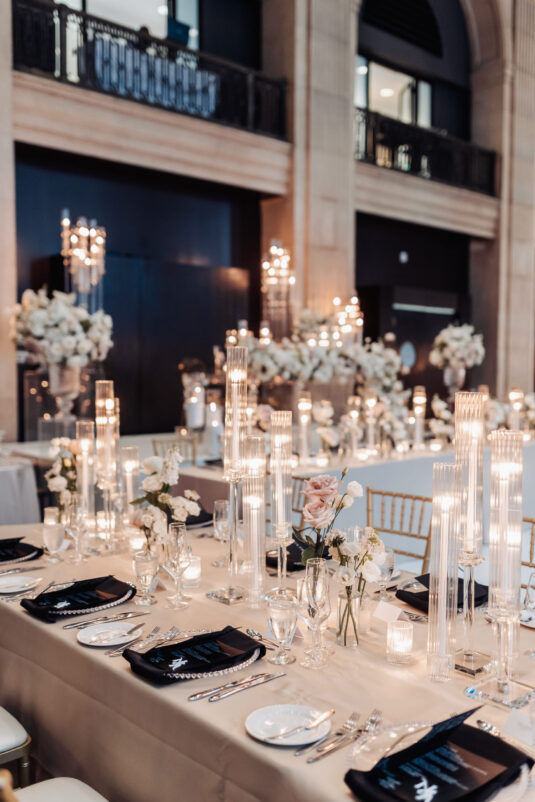 was nothing short of magical, with a romantic candlelit reception that set the tone for an unforgettable evening. Guests were welcomed by cascading candlelit staircases, a live violinist, and a breathtaking color palette of black, champagne, white, and blush pink. The Grand Banking Hall was transformed with towering candelabras, lush florals, and a moody yet sophisticated ambiance. The couple’s all-black dress code added to the chic aesthetic, while the bridesmaids shimmered in champagne gowns.