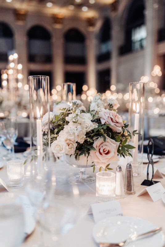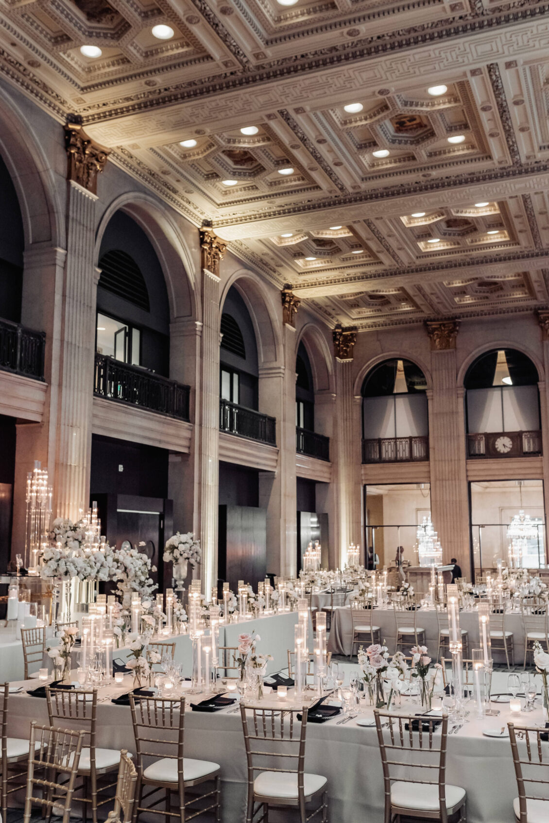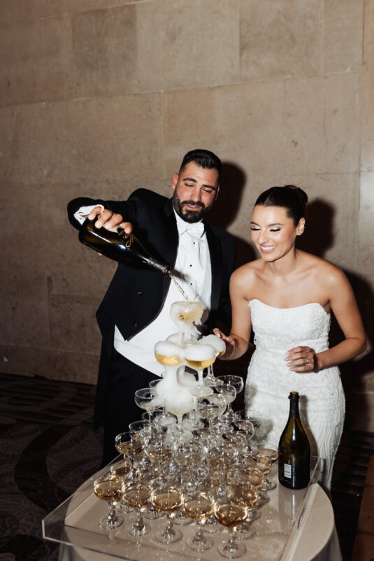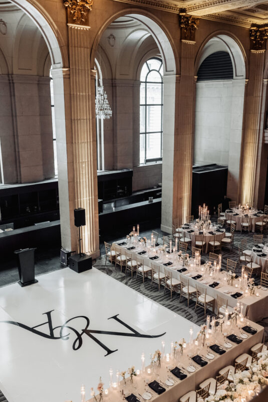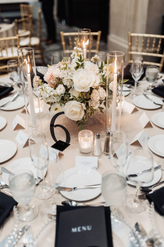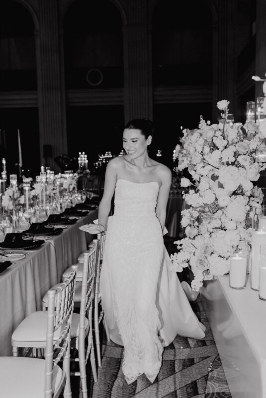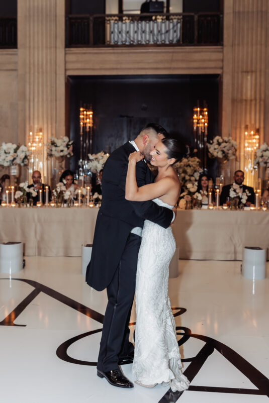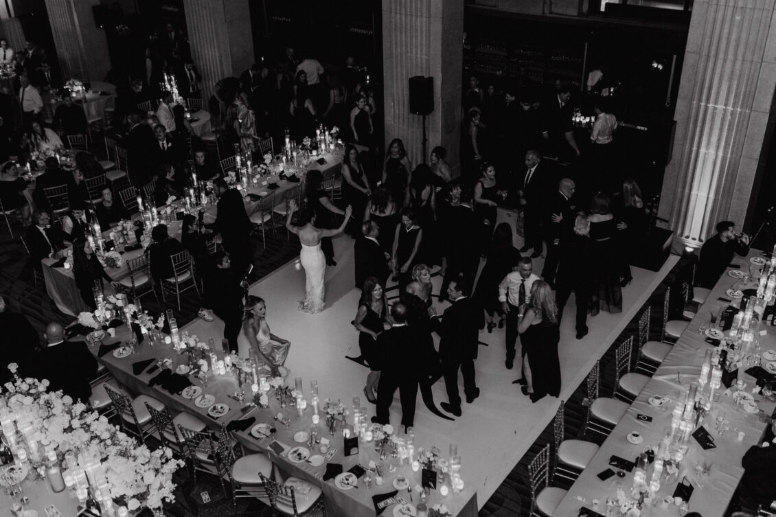was nothing short of magical, with a romantic candlelit reception that set the tone for an unforgettable evening. Guests were welcomed by cascading candlelit staircases, a live violinist, and a breathtaking color palette of black, champagne, white, and blush pink. The Grand Banking Hall was transformed with towering candelabras, lush florals, and a moody yet sophisticated ambiance. The couple’s all-black dress code added to the chic aesthetic, while the bridesmaids shimmered in champagne gowns.