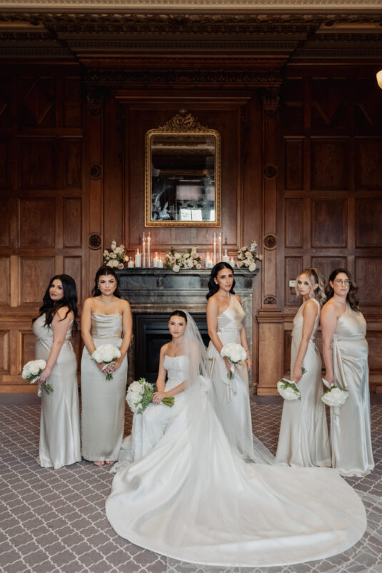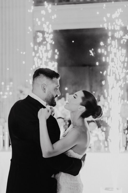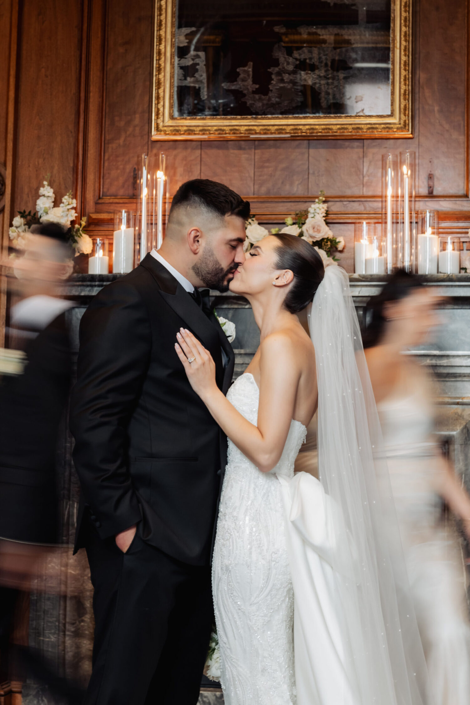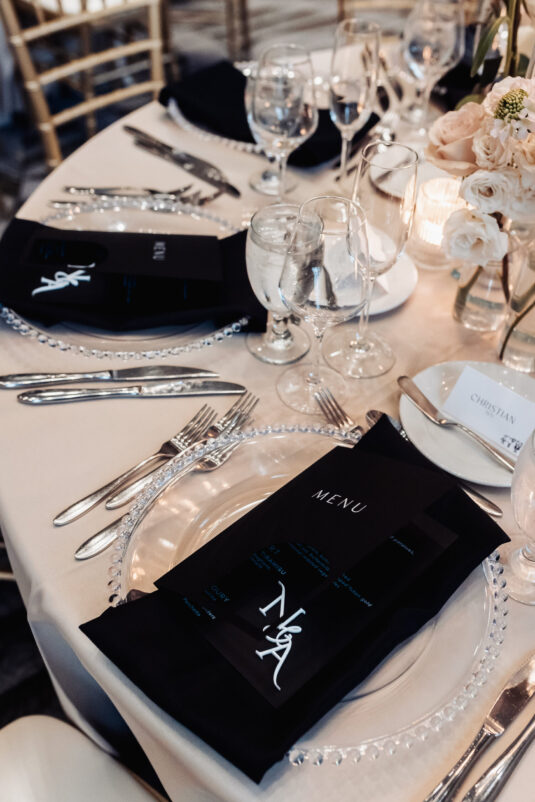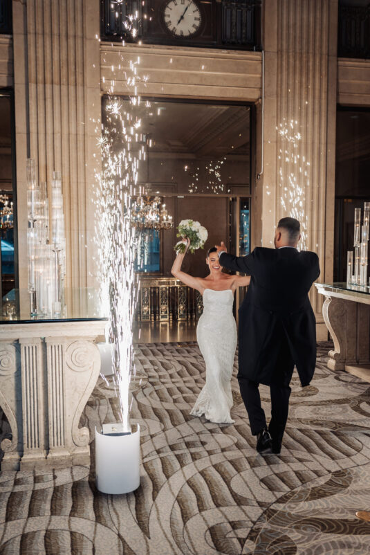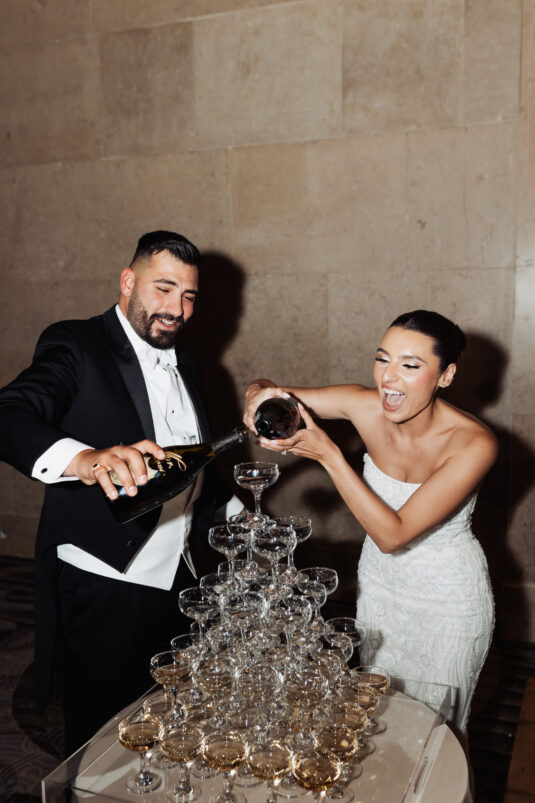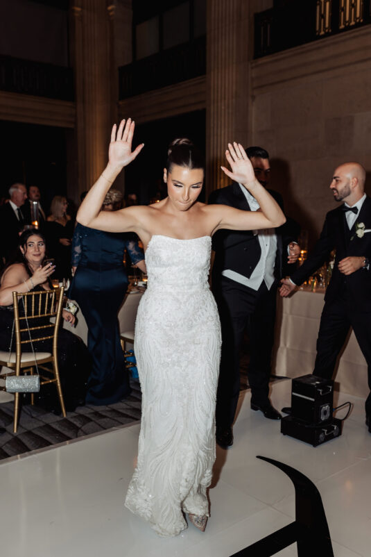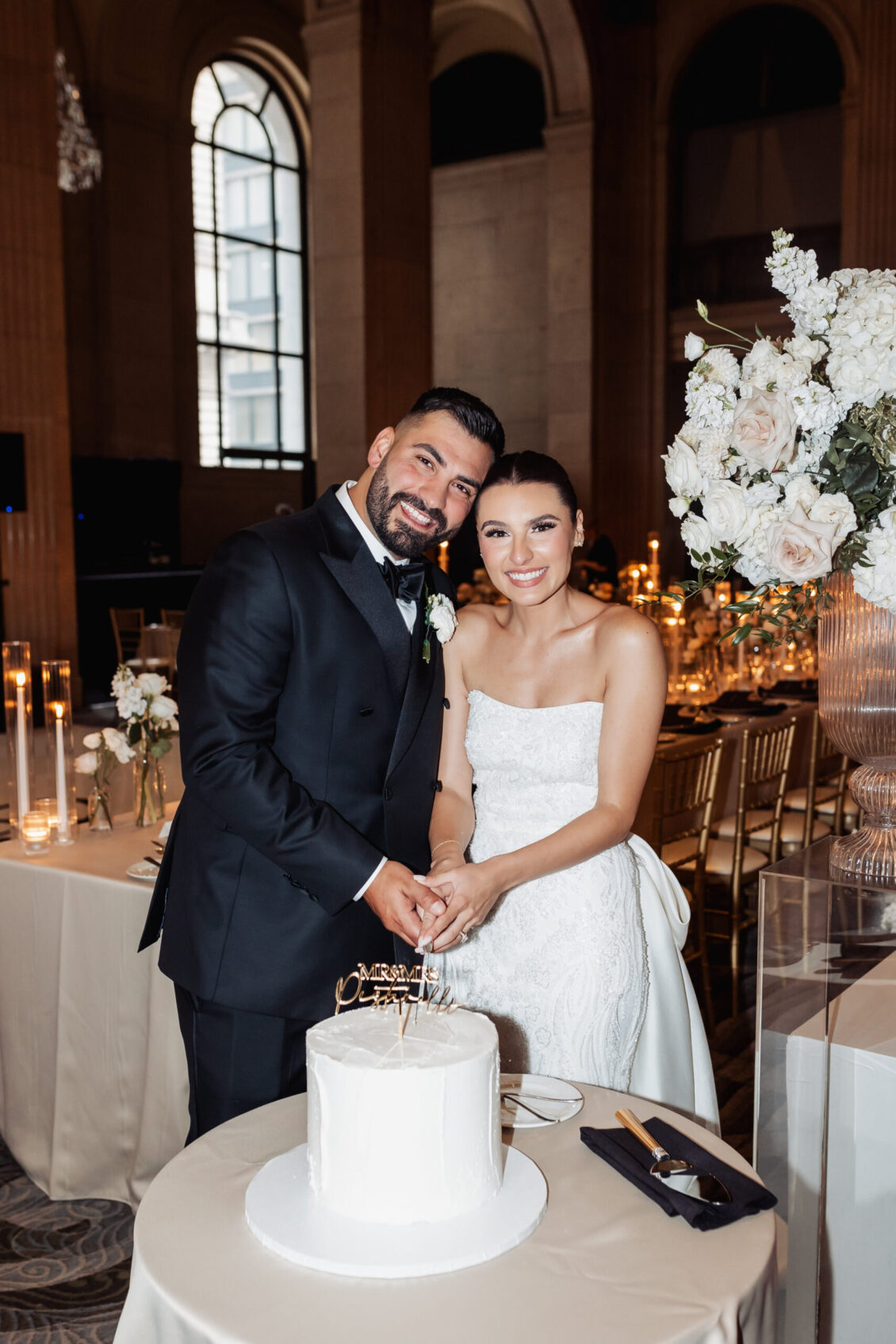 was nothing short of magical, with a romantic candlelit reception that set the tone for an unforgettable evening. Guests were welcomed by cascading candlelit staircases, a live violinist, and a breathtaking color palette of black, champagne, white, and blush pink. The Grand Banking Hall was transformed with towering candelabras, lush florals, and a moody yet sophisticated ambiance. The couple’s all-black dress code added to the chic aesthetic, while the bridesmaids shimmered in champagne gowns.
