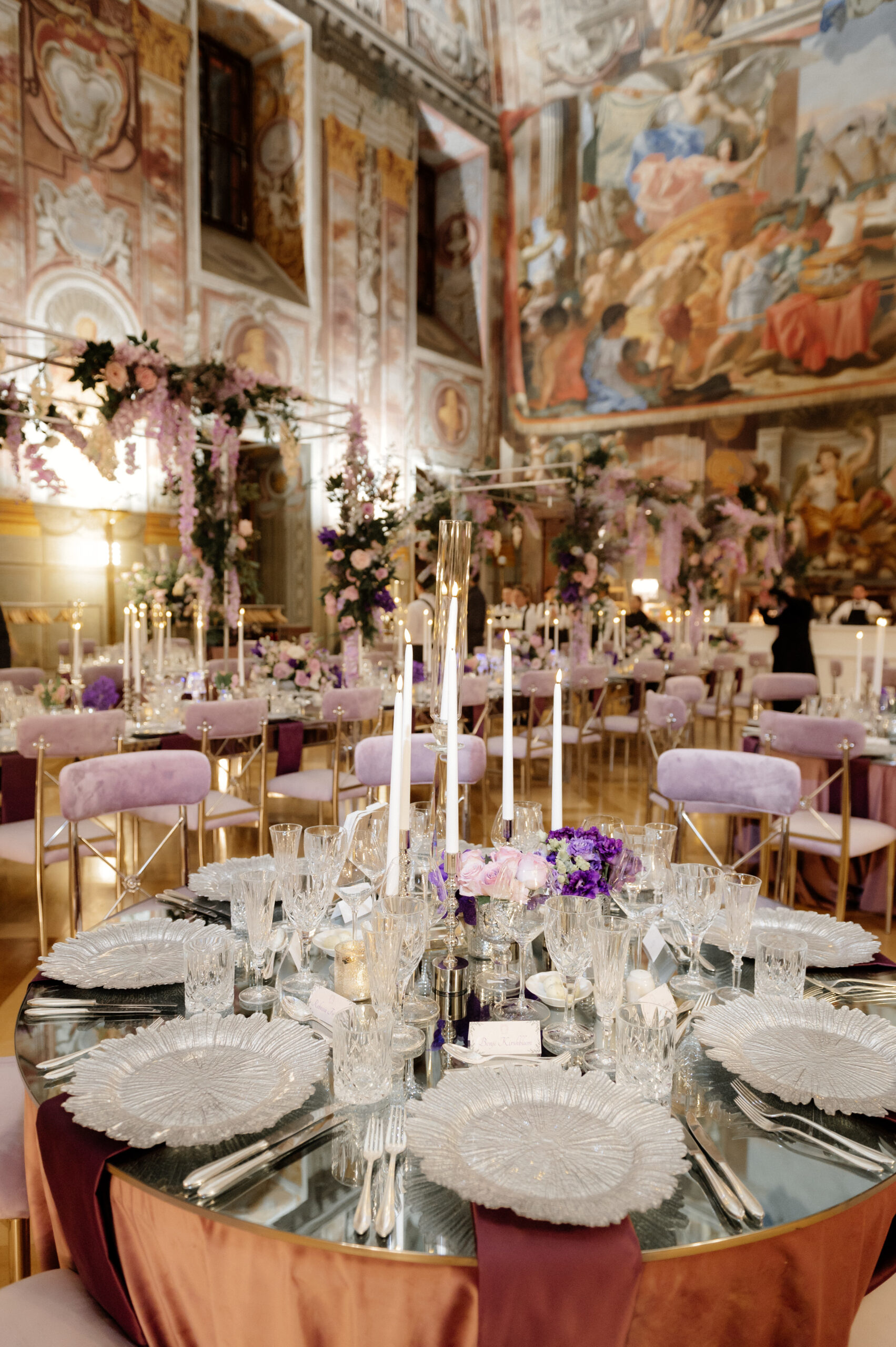 The elegant banquet hall at Troja Castle boasts lavish decor, perfect for a sophisticated wedding. A round table is set with glass plates, cutlery, and lit candles. Opulent paintings and floral arrangements in purple hues enhance the luxurious ambiance of this Prague gem.