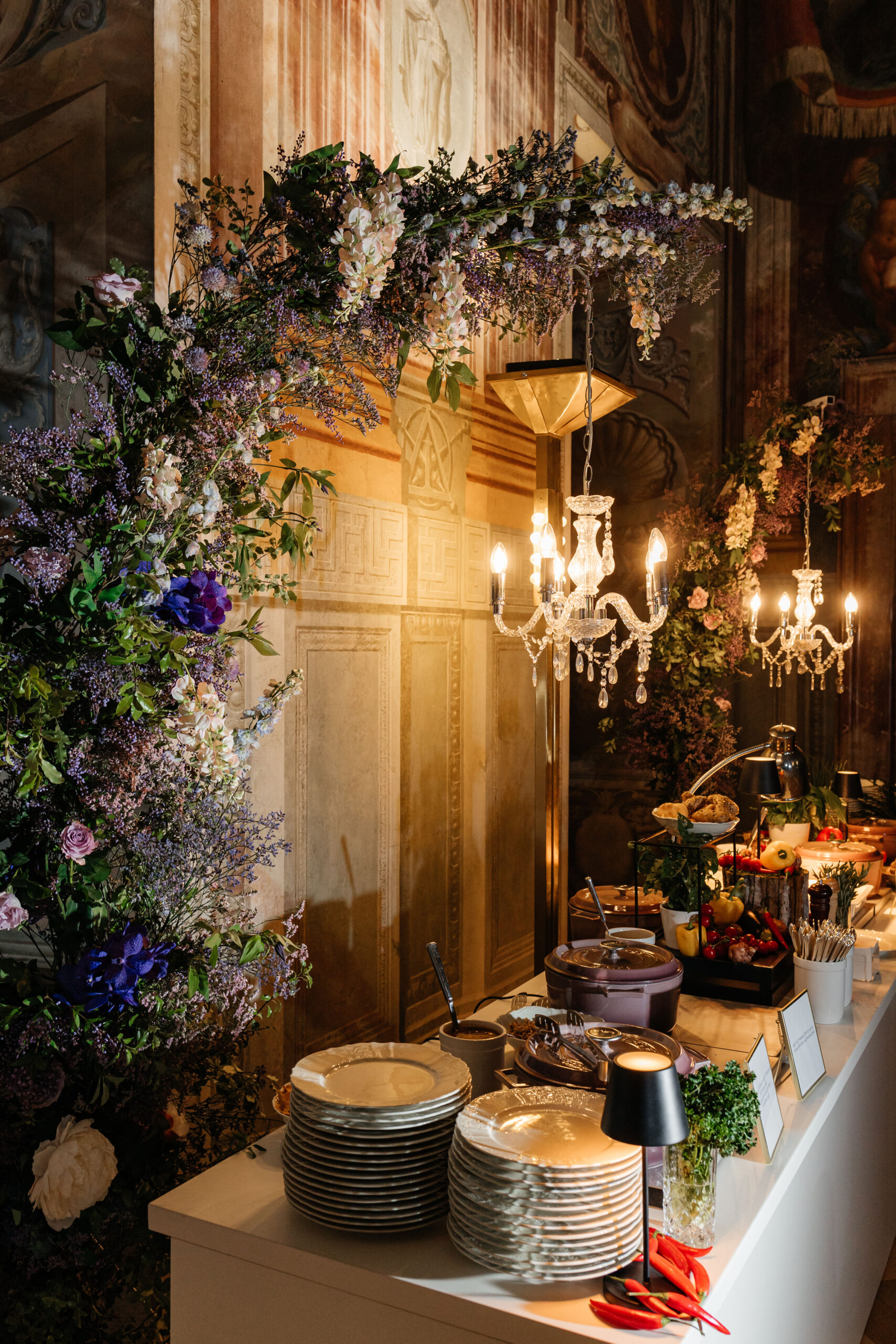 A lavish buffet setup at Troja Castle features stacks of plates and a variety of food items under ornate chandeliers. Decorative flowers arch over the table, enhancing the elegant wedding setting in a room with detailed murals reminiscent of Prague’s historical charm.