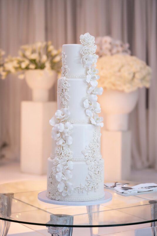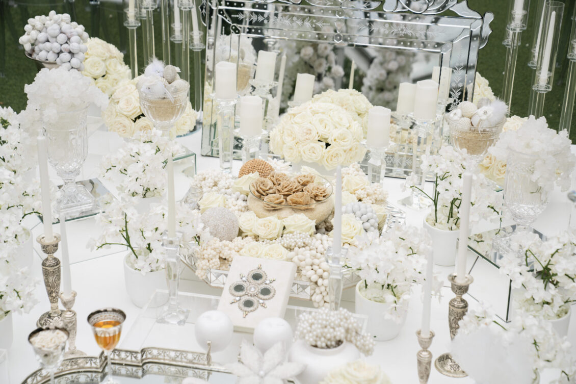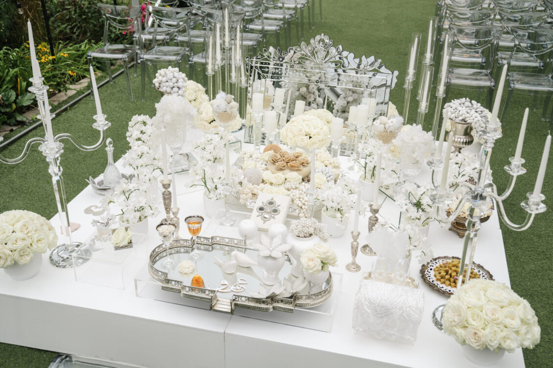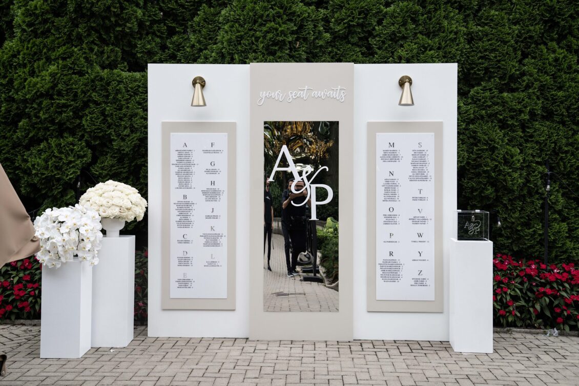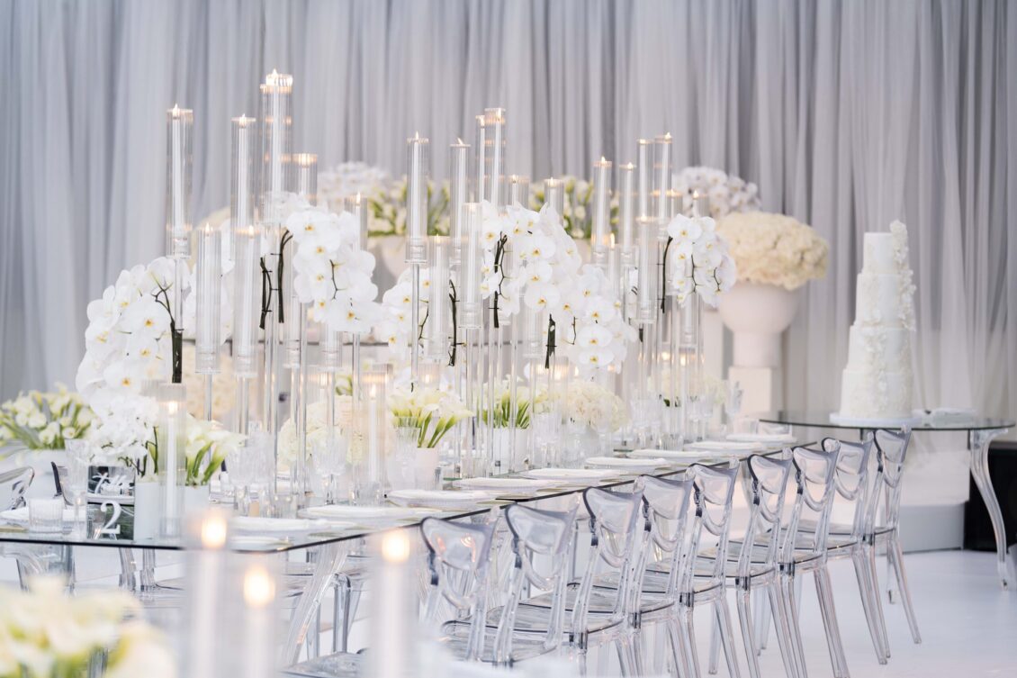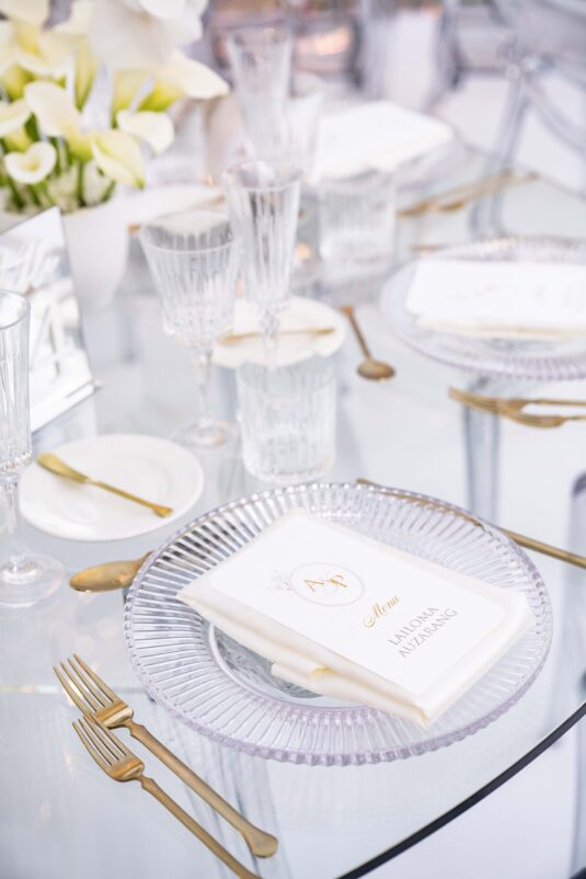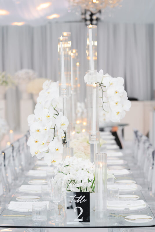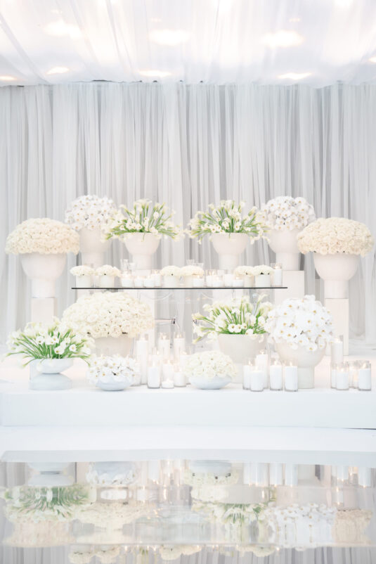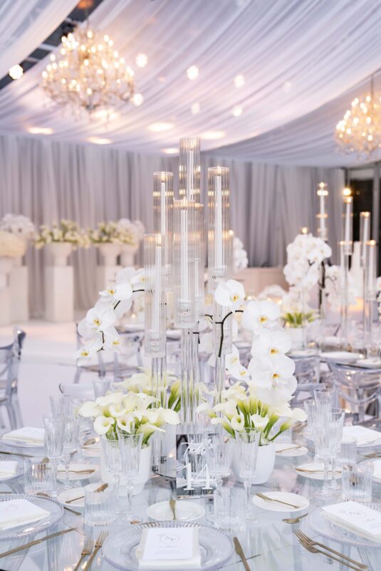 The historic estate’s Glass Pavilion was transformed into an ethereal wonderland. Towering arrangements of calla lilies, roses, and orchids cascaded throughout the space, creating a breathtakingly romantic atmosphere. Flickering candlelight danced across mirrored surfaces, from the dazzling seating chart to intricate mirrored stationery, seamlessly weaving together a theme of elegance and reflection.