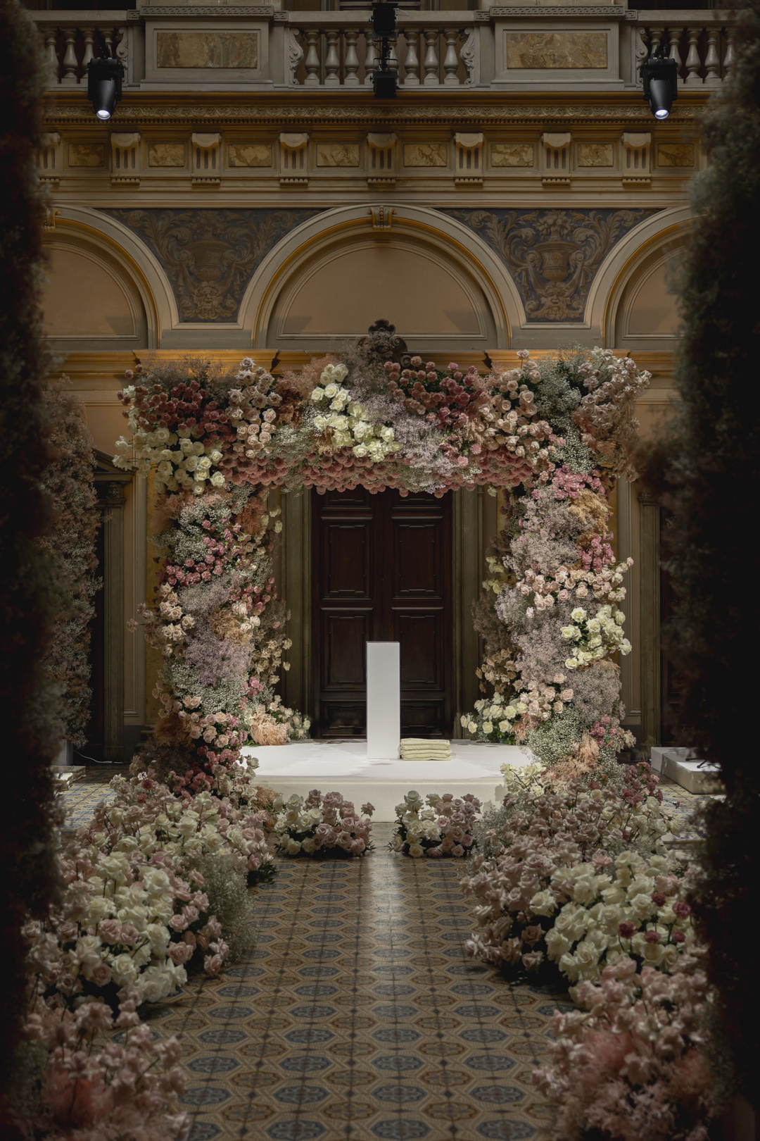 A grand floral archway made of pink, white, and cream blooms graces the entrance of a large wooden door in an ornately decorated hall, reminiscent of a Lake Como wedding. The floor boasts intricate tile patterns, with more flowers elegantly lining the pathway.