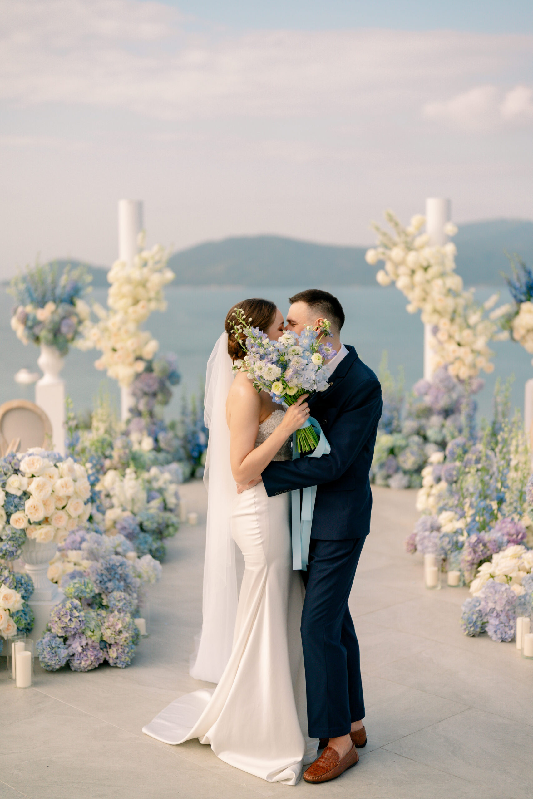 A couple embraces and shares a kiss at a luxury wedding in Phuket, adorned with blue and white flowers. The bride is in a white gown, holding a bouquet, while the groom wears a dark suit. The backdrop features mountains and a body of water under a partly cloudy sky.